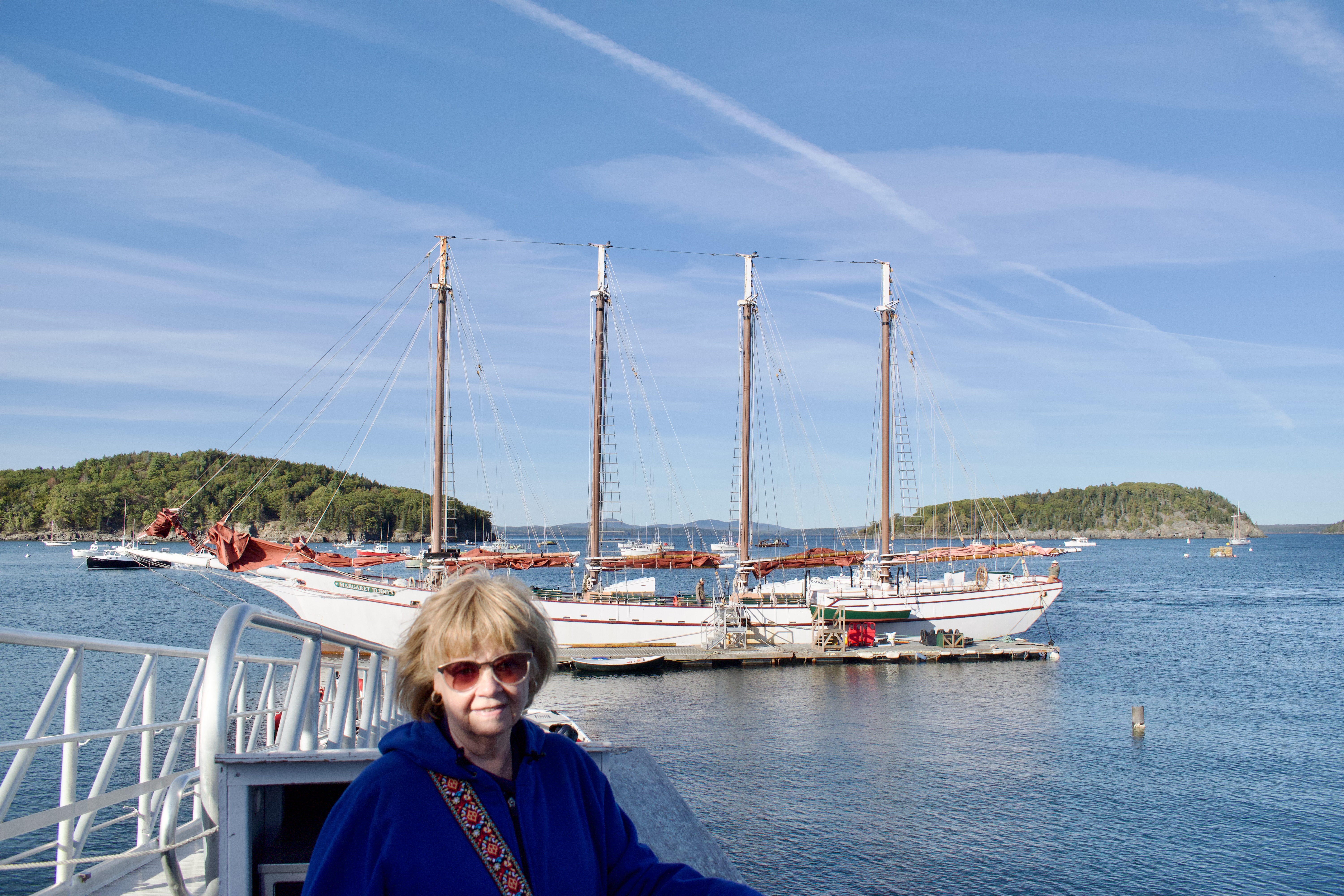 The four masted schooner Margaret Todd moors next to the parking pier with its sails furled. It takes passengers on sailing cruises three times a day: a short one each morning, a long one each afternoon, and a short sunset cruise each evening. On each one you get to see the crew unfurl and raise the sails and you get the thrill of racing along with the wind at full speed. If you've never been out on a sailing ship this is a truly magnificent experience, plus you get to see Frenchman's Bay, Hancock and Schoodic Points, and, according to wind and tide, the open ocean. Yes, the sunset is beautiful, and mornings are pleasant enough, but we recommend the full length afternoon cruise. |