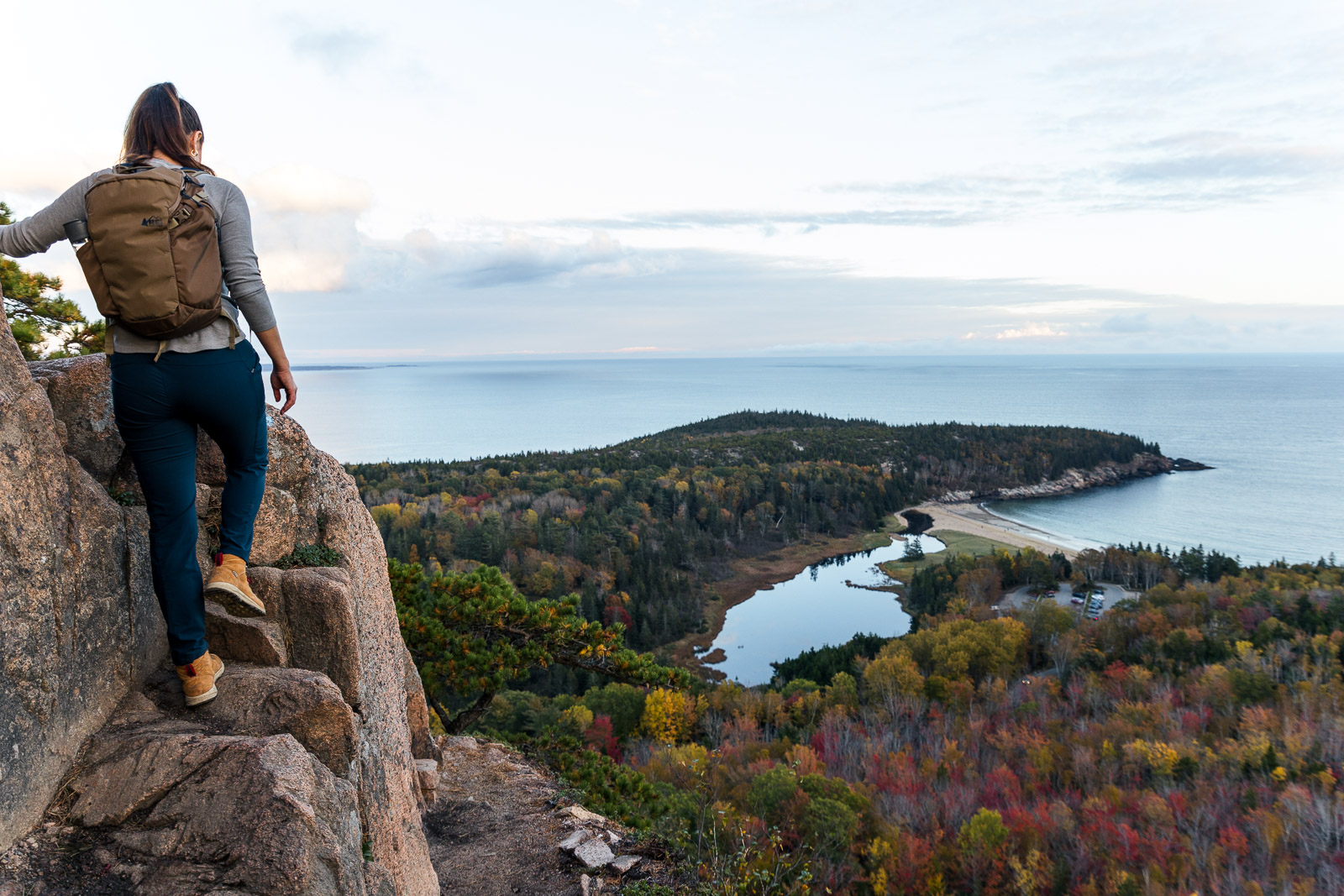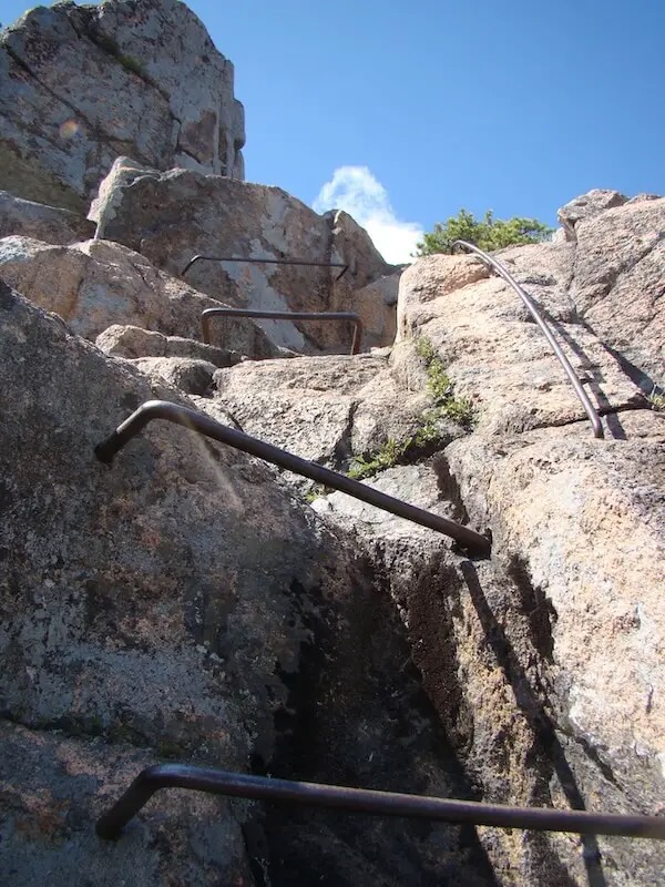 There is no backpacking or "wild camping" allowed on Mount Desert Island. Day hiking is the only option. But these are some of the most spectacular, challenging and sometimes dangerous day trails in the nation. The views are often breathtaking, looking out over mountains, the ocean and islands. You should not only be in good shape but be pretty flexible and athletic because there's a lot of scrambling and vertical climbing. You should have good body balance and tolerance for heights. Then you need to come well equipped. You need good, rugged shoes; a good day pack; and two bottles of water. You need good lightweight parkas for rain and cold, since the weather can change here in minutes and either bring intense rain or high wind and 40 degree cold, or sometimes all three. A good camera and binoculars are nice but they should fit in your pack because during certain sections you can't have them hanging around your neck. Do Not try to take pictures of the risky sections while hiking them. People fall here to serious injury or death every year while they try to take selfies or great shots while using only one hand to hold on. Instead, take photos of others, then put away your camera and climb with both hands. |