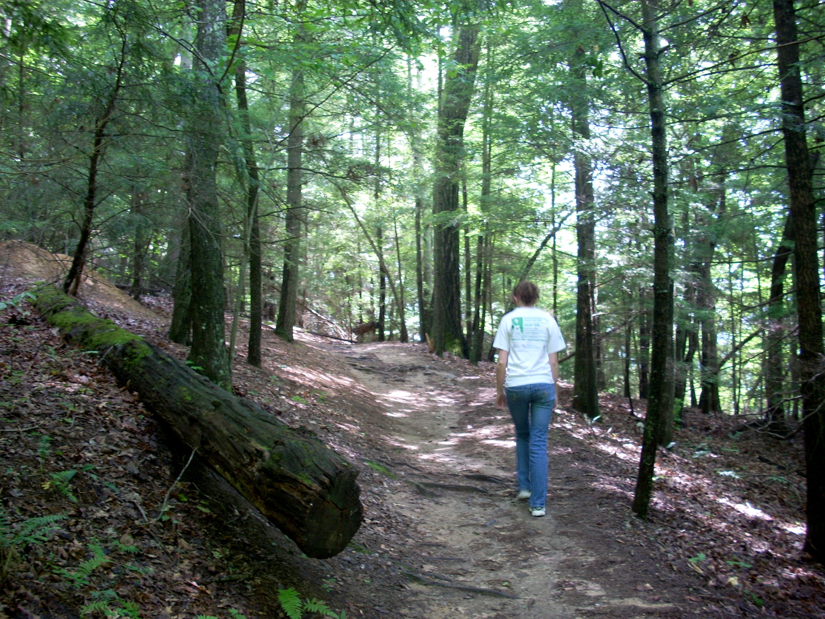 Suddenly you round the far Western point of the ridge and start climbing. As you climb and round the point, you find yourself in a much drier and sunnier zone. The Maples, Oaks and Hickories become far fewer and Rhododendrons and Pines dominate. Salamanders will be replaced by Fence Lizards, the Kentucky cousin of the Texas Horned Frog. You'll see them scampering on trees and rocks, but they're quick and clever and as you walk the trail they'll circle the tree to keep out of sight. Watch ahead of you to see them basking in patches of sunlight.