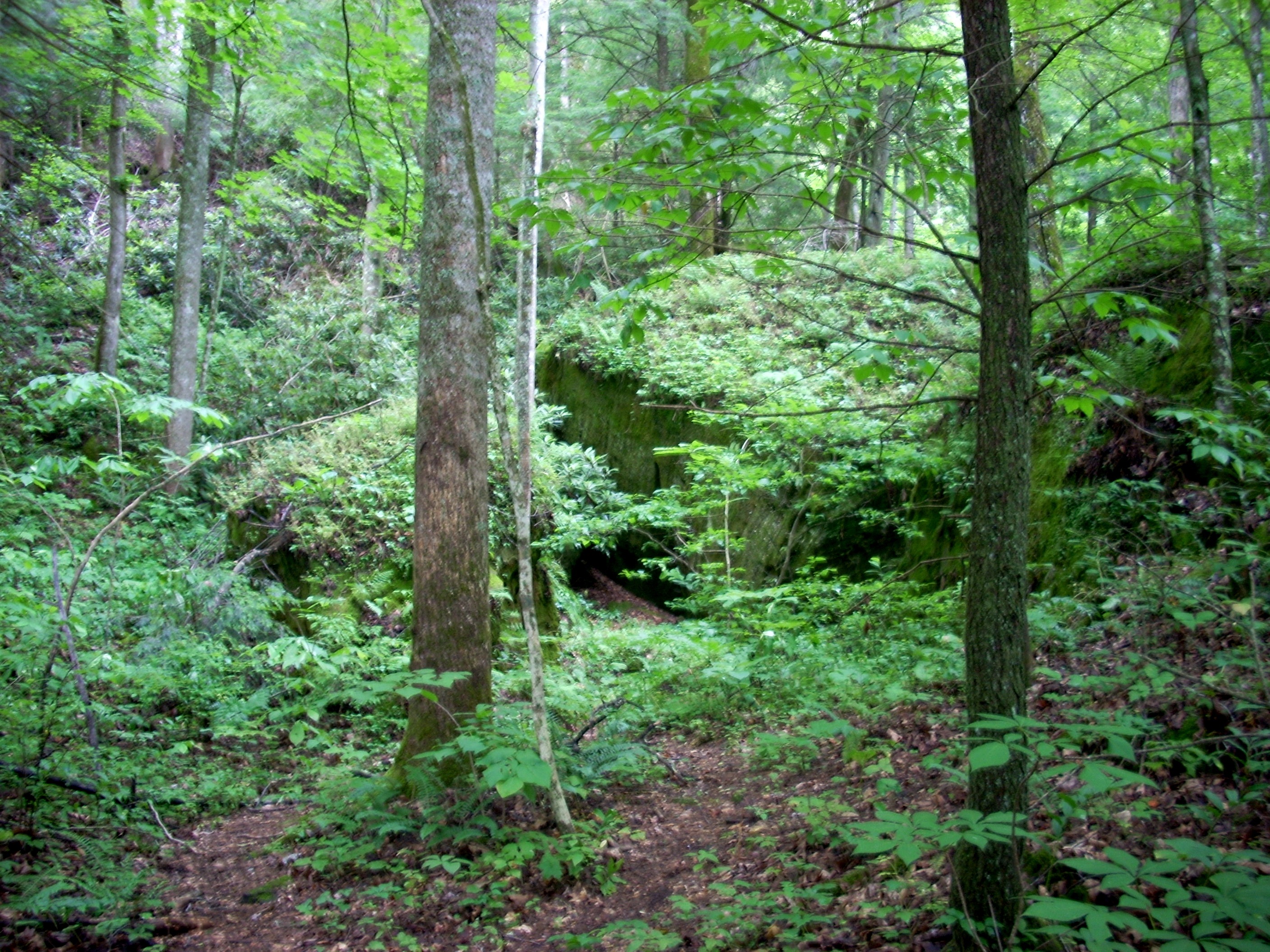 The trail winds through weird arrays of fallen rocks and passes large rock shelters in the cliffs on the left. Archaeologists have determined that these shelters were occupied by the Adena Indians for several thousand years. They preferred the high cliffside dwellings for safety and security, hunted the surrounding forest for game, and farmed the level areas down in the valleys, which they kept clear by annual burnings. |