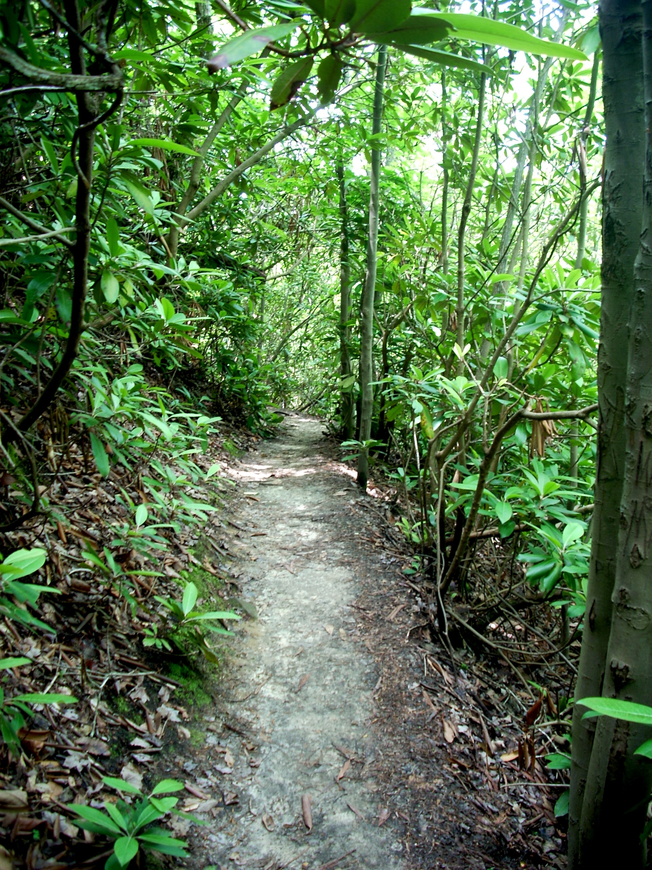 Once you reach the top, you hike the rest of the way to the Bridge through Rhododendron tunnels as seen at left. Rhododendron grow naturally in most of the Appalachians, but the Red River Gorge is their home ground and they grow taller here than anywhere else. This ridge is not their ideal habitat, and they do not reach the size they do several miles away in the deep Gorge, but they do grow pretty impressive here and add a special touch to the hike. Since they remain green year round, the trail remains very photogenic even in mid Winter. Mountain Laurel mixes with the Rhododendron and in May their flowers enliven the trail.