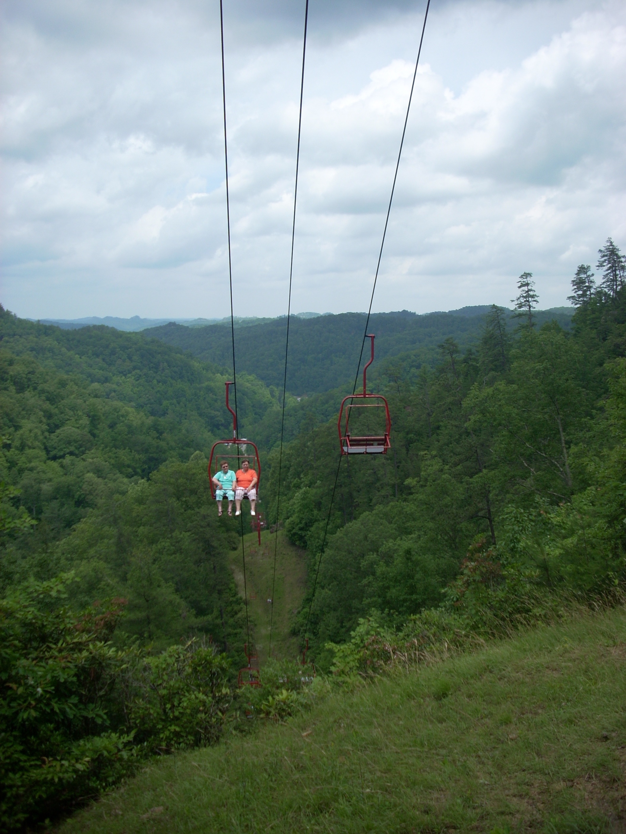 | As the trail nears the top, you pass under the Sky Lift, a ski lift that for decades has brought people up to the Bridge who are either unable or unwilling to hike it. The lift has its own parking lot. To reach it, turn right instead of left as you drive in the main entrance. Round trip tickets cost $9, although many people ride up and hike down. The lift does not bring riders to the Bridge itself. They come out at the point of the ridge, then hike half a mile to the Bridge. Each chair on the lift carries two passengers. The ride up takes about 10 minutes. It's a leisurely experience with spectacular views. |
