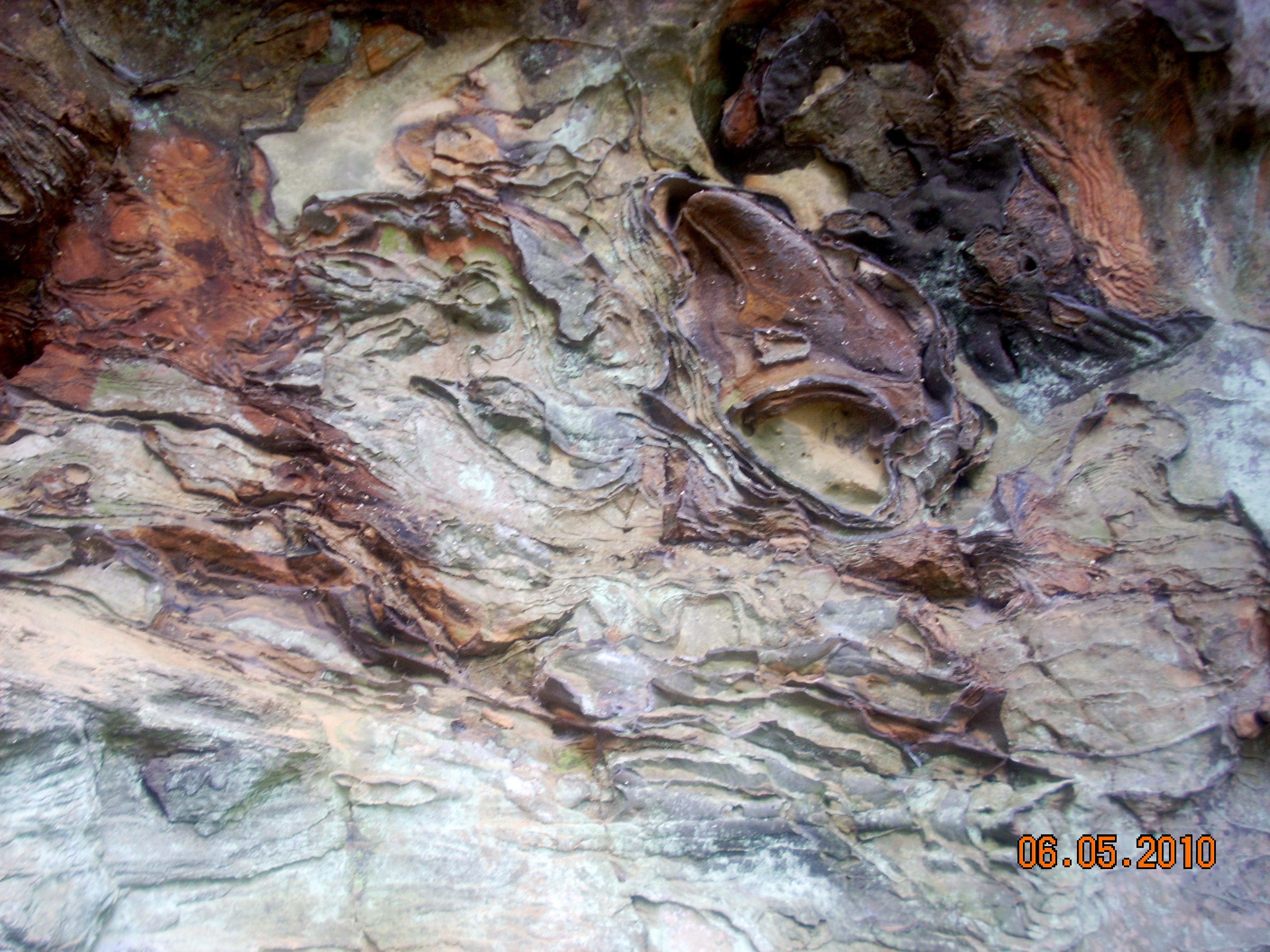 The rock faces on your left reveal the classic Kentucky Iron Rings, the dark brown edges visible here. There was enough high quality iron ore deposited in these rocks to inspire a brief iron industry here. Especially South of Natural Bridge, in Estill County, old iron furnaces still stand. For two decades men extracted iron from these deposits. It was very high quality. Unfortunately, it was in very low concentration. As other iron ore deposits with much higher concentration were discovered in Pennsylvania, Alabama and Minnesota, they proved to be more economical to extract, and Kentucky's Iron Era drew to a close. Today, we admire the iron deposits for the random designs they create, but they no longer have any financial promise. |