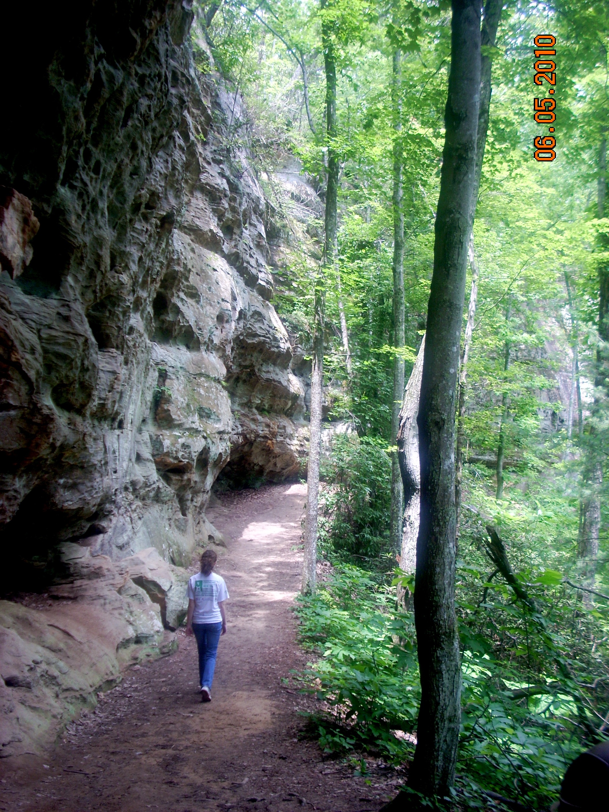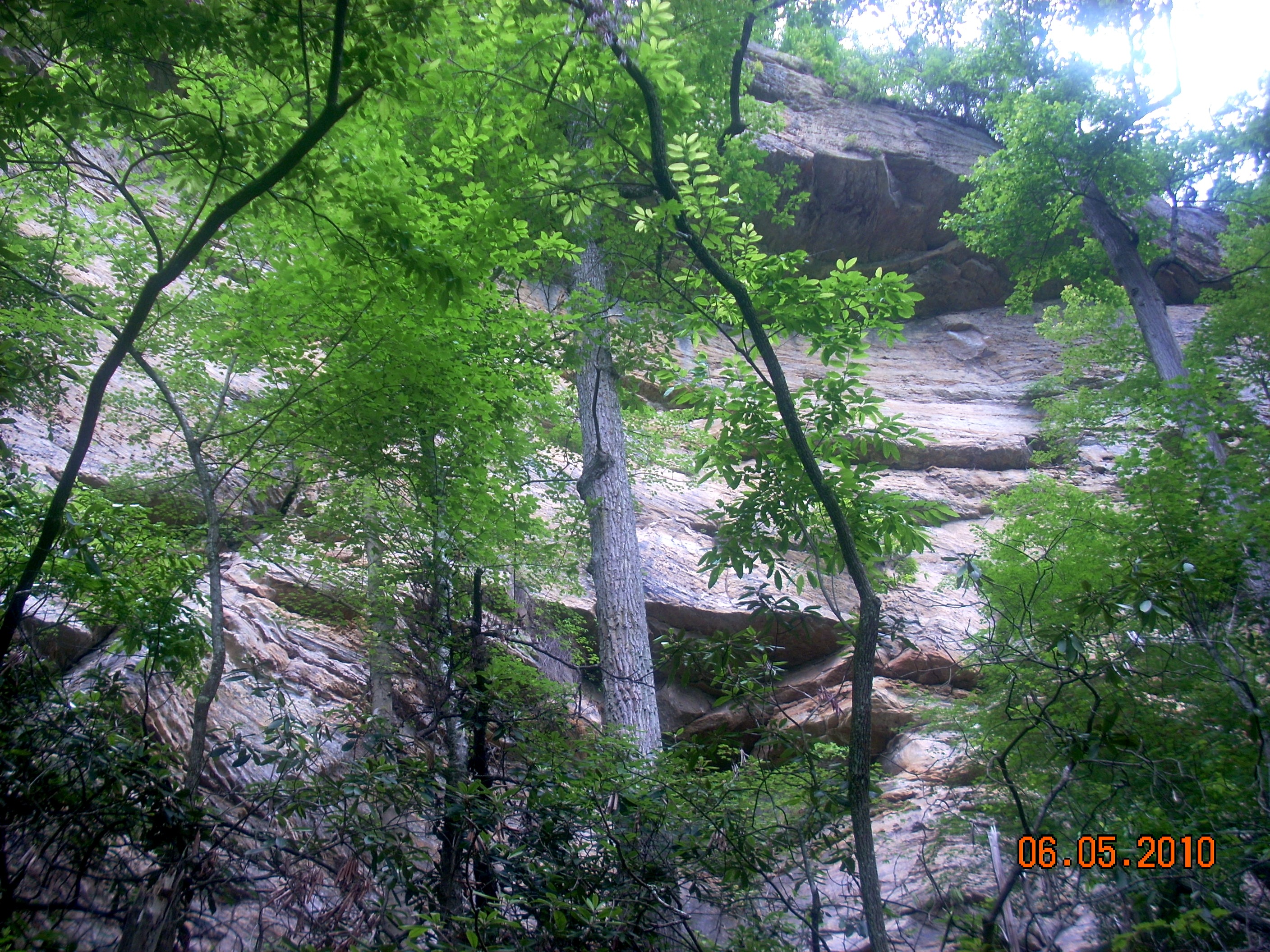 This is Battleship Rock from the bottom. Most postcard views of Natural Bridge are taken from the point up there. There are a lot of branches and some whole trees down in this section of the trail, lefrt over from the ice storm of 2010. The trail has been cleared but the debris remains off to the side. It needs to be totally removed, not only because it causes visual clutter on the forest floor, but because come Fall it will present a fire hazard. |