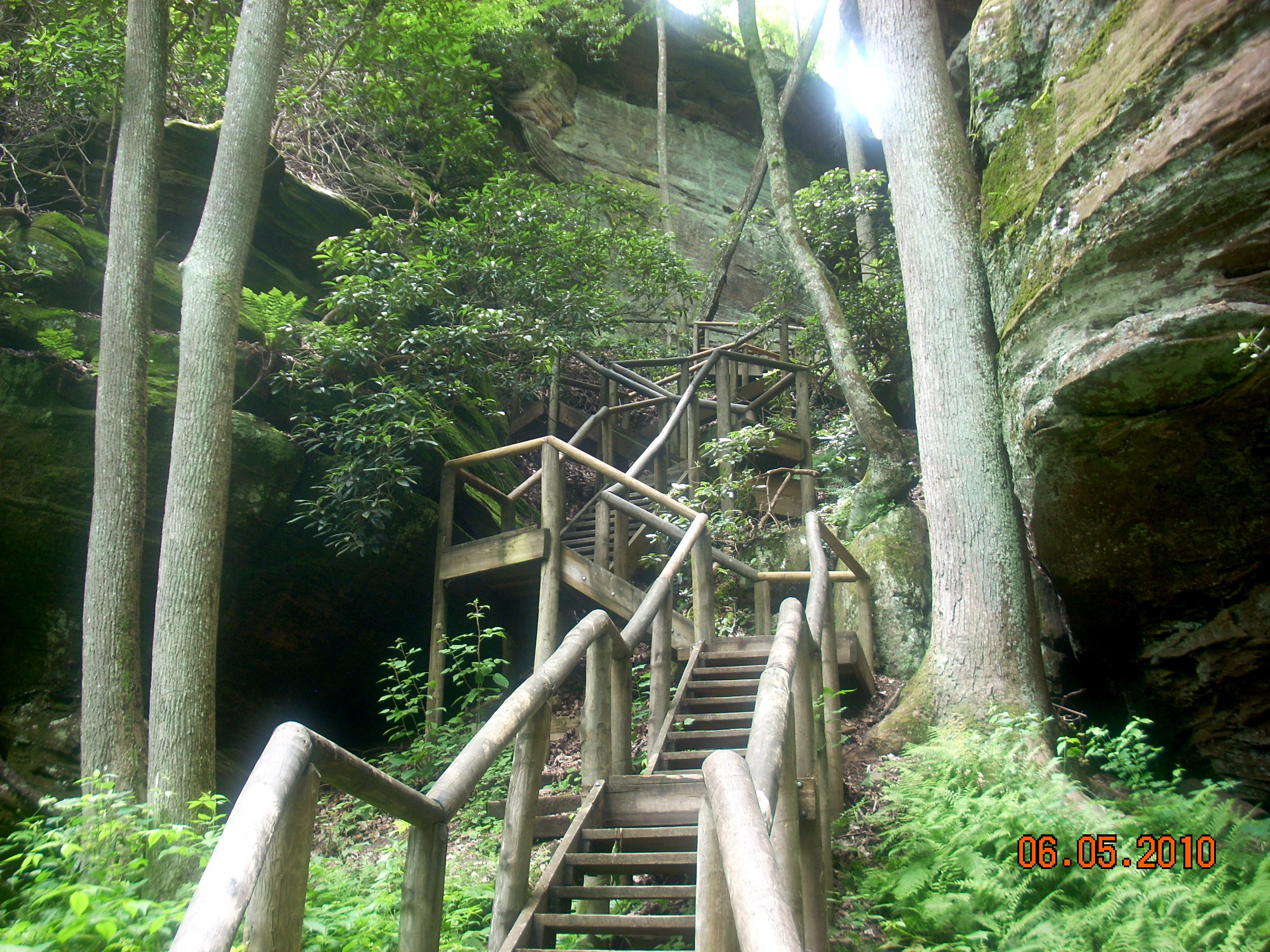 | This is the famous Devils Gulch Stairway, an absolutely amazing construction project that threads its way up through a cleft in the cliff. This staircase connects up on top with the Lovers Leap Trail. Once on top, you could turn left and hike to the Battleship Rock overlook. An ice storm in January 2010 took out sections of this staircase and as of June 2010 this route was still closed. The Park Service is awaiting appropriations from the State Legislature in Frankfort. A volunteer crew could do the work but it would need to be adults trained and esperienced in construction. This is maintenance well beyond the typical trail crew. |
