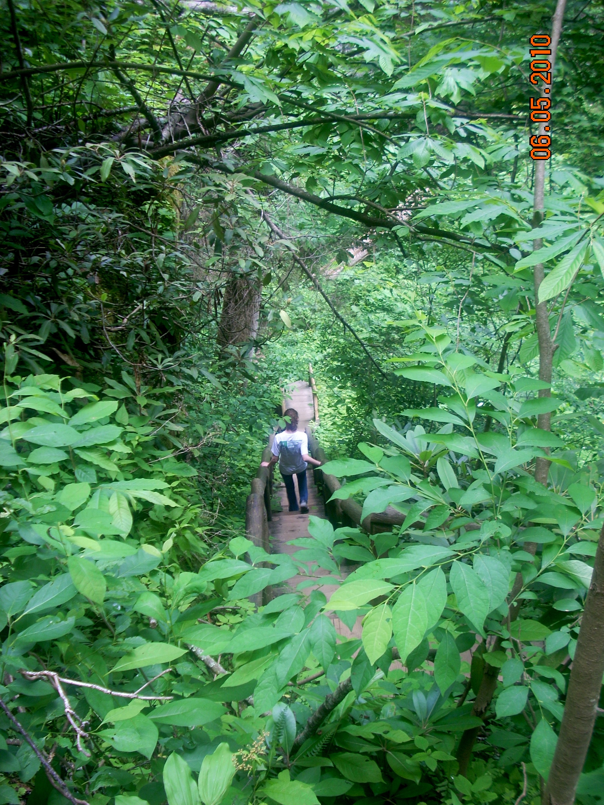 | This staircase is a lot more enjoyable going down than coming up. As you can tell by peering into the trees, it extends far down the hillside. The Park Service maintains these trails with their railings and steps but with recent government cutbacks funds have been harder to come by to hire men and buy materials. Volunteer groups, including Boy Scouts, schools and the Sierra Club, have become more important. If you would like to volunteer personally or can talk an organization you belong to into volunteering, stop by the visitor center on the way out. They'll be happy to talk to you. |