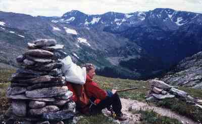 The trip across the top is surreal. You're crossing tundra, surrounded by patches of snow. The sun is bright but the wind is icy. The trail is marked by rock cairns, seen in the photo at right. You'll be entertained by rockchucks, who live in burrows or rockpiles. They whistle at you as you pass. You can put your pack down and chase them across the rocks and they'll disappear and reappear behind you with a whistle, cheerfully playing hide and seek as long as you want. Just to your left (east), you can walk over to the edge and look down on Glacier Basin. And, after a lunch stop (photo right) at the main trail junction where the Bear Lake Trail heads down to Glacier Basin and the eastern section of the park, you can actually see the weather fronts forming down in the valleys to the west. Don't think that once you start down the switch backs (photo below right), your day is done. You can see July campsite below you, but the switchbacks are steep and footing can be treacherous, especially if you get caught in the afternoon rain. |