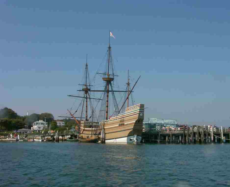 The Mayflower, seen here from out on the harbor, is a magnificent historical artifact. It does need continual repainting, recaulking, rerigging and other maintenance. But Americans continue to lavish tender loving care on the ship. It is surely one of the most photographed vessels in the world. Hundreds of thousands of people every summer come on board, poking around the lower decks, gripping the tiller, peering up at the crow's nest, taking whole rolls of film, trying to imagine what it was like to actually cross the ocean on this surprisingly small boat, or even what it would be like to be one of the crew every Summer when it goes out on its shorter cruises down to Mystic or out to Provincetown. |