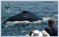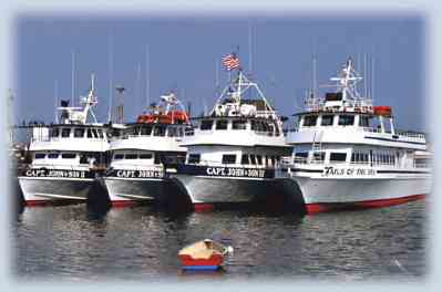 | While you're here, we recommend a whale watching cruise. A triangle drawn between Plymouth, Gloucester and Cape Cod encloses the Stellewagon Banks, the world's greatest whaling grounds. You will see some from the ferry and a few from the local beaches, but to really get up close and personal, treat yourself and your group to a four hour cruise, departing at 9 am and 2 pm in early June and three times a day the rest of the Summer. There are special family and group rates. You will see Minke, Humpback, Finback, Right and Pilot Whales and Seals, Dolphins, Porpoises and Sea Turtles, plus a wide variety of sea birds. Some of the whales you see will weigh 65 tons and be longer than your boat. An on board marine biologist will point out special features and answer any questions. The ship's galley serves drinks and snacks. There are two open decks and an enclosed cabin | ![]() |