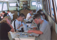| Another outstanding option in Plymouth, especially if you're bringing a youth group or a family with kids, is a day in the Floating Classroom Program. You go out on Cape Cod Bay in a research vessel, with microscopes, various tanks and gauges, and staff members with degrees in Marine Biology and Oceanography. The ship holds an Onboard Tidal Pool, a tank containing seawater and spider crabs, sea stars, sea lettuce, and other ocean organisms. The students study structure and function of these animals. They will also use plankton collectors to gather protozoa, then study them under the microscopes. They use the secchi discs and depth bottles to measure chemical and physical aspects of the water, testing them with traditional scientific procedures. A lobster man will demonstrate lobster equipment, pull aboard a sample lobster trap, and use live lobsters to teach about the species. www.captjohn.com. | ![]() |