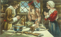 You might have a light lunch of soup and sallet, then plan on an early 4:00 dinner. We like the Cranberry Soup, Venison Skewers, Stuffed Quahog, Nausump, Indian Pudding, pies, custards and tarts. If you eat dinner, the Venison, Duck and Quail are memorable. On selected dates in the Summer Plimoth stages an evening Thanksgiving Reenactment for those who are unable to attend the famous November event. |