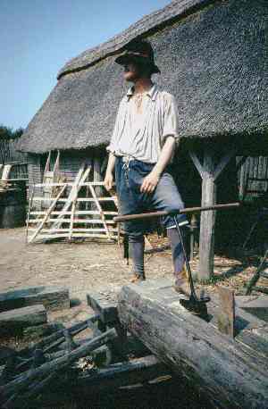 In addition to the physical items (houses, clothing, tools, etc.), one of the goals of the Plantation is to research, recapture and preserve the skills of the Pilgrims. From crude beginnings, they developed into gifted artisans of every kind. From chairs to baskets to lamps, they created a uniquely American style. In workshops as you explore the Plantation, you'll see craftsmen practicing these arts, displaying finished products, and sometimes even selling them. They use only the tools and materials appropriate to that time, recreating the patterns found in museums or private collections. Many people spend an entire day at the Plantation just moving from worksite to worksite to study the skills being demonstrated. Others take classes and spend a day learning a specific skill. You should check in advance to see what is available. | ![]() |