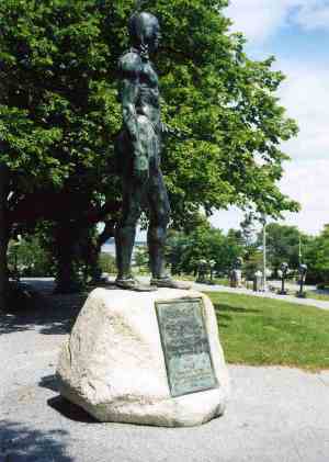 Also on Coles Hill is the Statue of Massasoit, the great Wampanoag chief without whose help the Pilgrims would not have made it through the Winter. It was ironic that Miles Standish was brought along with his cannon, muskets and powder, to defend the colony, but he instead became The Great Peacemaker, befriending Massasoit and guaranteeing that no attack came. As long as Standish and Massasoit lived, the peace was never broken. But there was a reason for this. Massasoit was 35 and recognized as a great chief, but he presided over a devastated people. Portugese fishermen introduced the Bubonic Plague, to which they had evolved immunity, but Native Americans had none. It almost wiped out the New England coastal tribes. The Wampanoag were reduced from 12,000 to 1500 between 1616 and 1619. Their bitter rivals to the West, the Naragansett, had been almost untouched. Massasoit was left with far too few warriors to hold off the Naragansett. He desperately needed a powerful tribe with which to ally. Then, one day, as if sent by the Great Spirit, a magic sailing ship appeared on the horizon. If you look South from the statue, past Town Brook, you can see Watsons Hill, where Hobomok's home and farm were. At Morton Park, at the upper end of Hobomok's farm, Massasoit and his men camped while talking treaty with the Pilgrims. Whenever Massasoit returned to Plymouth, that was where he camped, close to but outside the village. Other Wampanoag homes and farms were two miles South along the Eel River. As Plymouth expanded, Hobomok sold them his land and moved further out. It is Hobomok's farm which is re-created at Wampanoa adjacent to Plymouth Plantation, but the re-creation is along the Eel River. ManyWampanoag did farm there, but Hobomok was not one of them. |