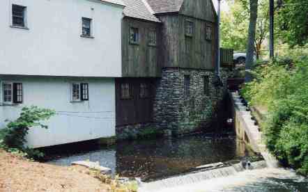 | Come down off Cole's Hill and cross Leyden Street into Brewster Gardens, with Town Brook flowing through it. Herring have always come up this stream to breed, and the Wampanoag caught them for food and to place in hills of corn, squash and pumpkins for fertilizer. They taught the Pilgrims this trick, which allowed for the bountiful harvest leading to the famous First Thanksgiving. The mouth of Town Brook was deep and wide enough to admit a small sailing vessel. The Pilgrim Maiden Statue here honors the Pilgrim women. Scenic Town Brook Trail leads to Jenney's Mill. A front view of the mill is on the restaurant page. Shown here is the back, with the fish ladder leading up to bypass the mill wheel. Herring use this ladder to get to the lakes where they lay their eggs. The young then swim down the ladder and back to the ocean. This was the first mill built in America, and allowed the Pilgrims to grind their corn into meal, which they could easily store for their own use or ship back to England for sale. You can take a tour of the mill, buy a bag of freshly ground corn meal, and eat in the restaurant. | ![]() |
