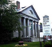 Walk down Main Street to Pilgrim Hall Museum. This opened in 1824 to house the incredible collection of artifacts kept by descendants of the Pilgrims. The Museum is still receiving donations of artifacts, and is planning an expansion which will almost double its size. This is the oldest public museum in America. It contains the most complete collection of authentic Pilgrim possessions including furniture, clothing, paintings, books, cradles, mugs, documents and weapons. Perhaps its prize is the relic of a ship that brought later colonists to Plymouth. Miles Standish's sword and John Alden's halberd are displayed. A slide show on Pilgrim history is worth watching. The building itself is a historical masterpiece. There are worksheets for children and learning packets for school groups. The offices of The Pilgrim Society are here. Closes at 4:30. Adults $3.00, children 6-15 $1.00. |