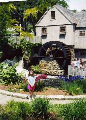 The final recommended restaurant in the town is Jenney's Grist Mill. And take your camera. This is a fine lunch stop. You walk South from Plymouth Rock, pick up the Town Brook Trail, and enjoy a beautiful mile and a half stroll up the forested valley, along the babbling waters, to this historic old mill. Meticulously maintained, lushly landscaped, the building demands several photos. This mill was built by John Jenney in 1636 to grind corn. It still works, and is still owned by descendants of John. Nancy is the current proprietor.The lake above the mill is spring fed, so even during dry spells the brook runs and the wheel can operate. On the back side of the mill, opposite this photo, is a fish ladder allowing herring to swim up the brook and get to the lake, where they spawn now just as they did in the 1600s. If you are here in early June you can see the last of the spring's herring run. The Wampanoag taught the Pilgrims to catch some of these fish and use them to fertilize their gardens. But herring aren't the only wildlife here. Ducks, geese, swans, turtles and various species of fish live in the mill pond. This was the first grist mill built in America, and was the archetype of the thousands built in the following three centuries. You can take a guided tour before or after you eat, and buy a bag of freshly ground corn meal to take home with you. The wheel is paused in this picture but runs most of the day. The restaurant inside is also a classic. The menu changes over the year but if it's available the Cranberry Bisque is a must. If not, try their interpretation of Clam Chowder, which is made with red potatoes and is unlike the others you've tasted. There are various salads, sandwiches, rollups and desserts, all excellent. We always order whatever is the daily lunch special. This is a small restaurant, done in Pilgrim post and beam style, with windows looking out on the mill pond and down the leafy valley. During a long day's tour of historical sites, it is a great retreat. In the evening, it becomes a classic tavern with live music. When you're done with your meal, outside, just to the right of the wheel, is the best ice cream counter in town. (In the photo at right, the people standing on the deck are at that counter). |
