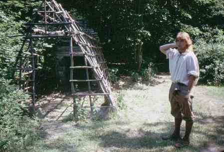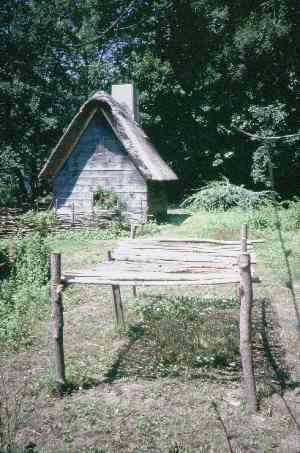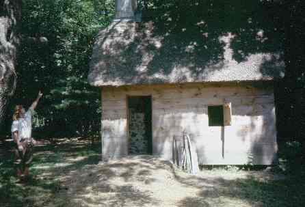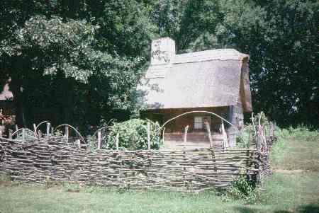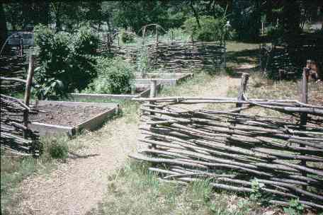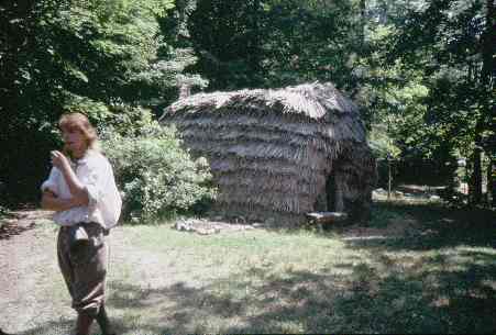 While the Pilgrims used the Mayflower for shelter the first Winter, lived in dugouts the second Winter, and finally got crude shelters built for the third Winter, the Puritans set up lean to frameworks immediately (above, center) and over laid them with thatched roofs (left). The result still looked pretty crude, but made a warm dry shelter. With immediate shelter needs satisfied, the construction crews worked all Summer and Fall on better homes, the craftsmen set up to practice their specialties, designated men hunted and fished, and the general population planted and tended the gardens. By the first November, the Puritans were much better off. | ![]() |