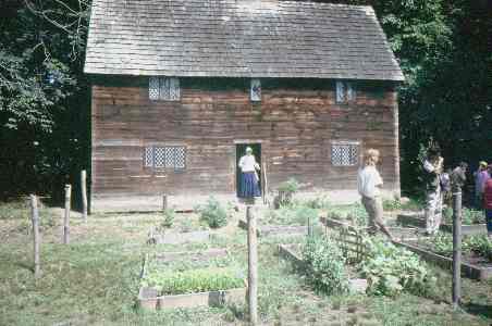 | The town's first full two story building was the Meeting House (above left). They held four hour services here every Sunday morning, Sunday evening and Wednesday evening. Attendance was mandatory. There were no seats; everyone stood the full four hours. If someone fainted from the heat, those around them held them up until the end of the service. Notice the glass windows of this 1640 building. The homes of that year still had mere wooden swing out shutters, as at right. Church Council also functioned as the town council. Salem was a classic Theocracy. The Church passed and enforced all laws. | ![]() |