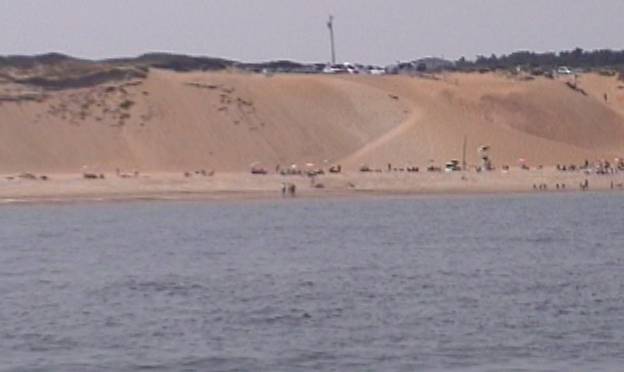 Marconi Beach is three miles from Paine's and six miles from The Stone Lion and Duck Creek, but it has lifeguards, restrooms and showers. It also offers an important historic site up on the plateau. This is where Gugleimo Marconi erected his towers and sent the first telegraph message across the ocean in xxxx. The beach itself is much like LeCount and Cahoon. There is no restaurant or concession, but there is a decent path leading down from the road. The sand is still fine, but is less white. Marconi Beach takes quite a pounding from storms and the beach may appear quite different from year to year or even from one week to the next. The bottom may level out or steepen, the surf may increase or decrease, and the beach may widen or narrow. This is almost exactly halfway down the Cape, and the southernmost beach in the Wellfleet deed. Marconi is the least crowded of the Wellfleet ocean beaches, but has its small corps of devoted fans. |