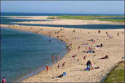 | Cape Cod's natural beaches are rivalled only by North Carolina's Outer Banks, and which has the best is a matter of continuing debate. Cape Cod possesses 560 miles of coastline, most of which is in beach, highlighted by one 40 consecutive mile stretch of pristine Atlantic Coast sand. North Carolina can boast that its waters are warmer, its Lighthouse Point waters are the best surfing location on the Atlantic Coast, and more of its beaches are easily accessible to the general public. Cape Cod does have a problem in that many of its beaches require a very expensive permit and many more are theoretically open but blocked off by private property between the beach and the nearest road. However, Cape Cod does have more spectacular dunes, more lifeguards, more concession stands, no problems with jellyfish, and more calm water beaches which favor families with small children. Of the 100 beaches on The Cape, we think those at Wellfleet are the best, part of the reason we like lodging there. | ![]() |