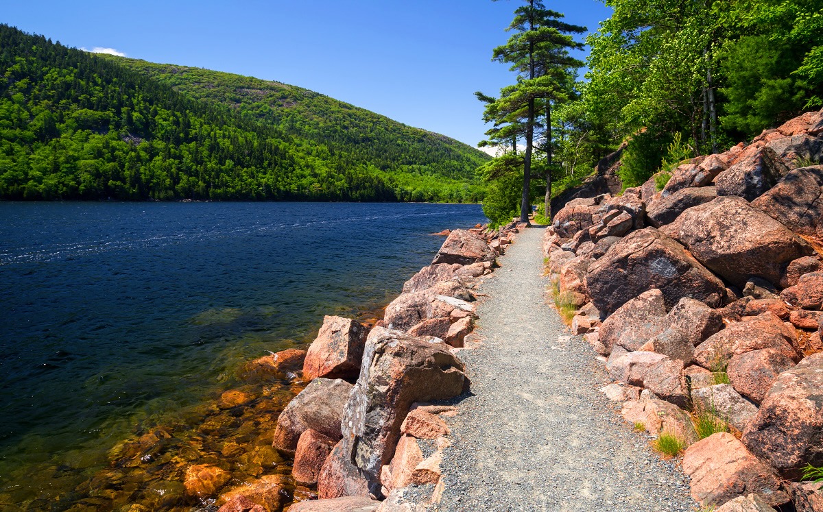 | The first three trails we listed are steep climbs, so for our fourth we suggest Jordan Pond Loop, a three mile perfectly level stroll with beautiful scenery. Jordan Pond itself is a charming mountain lake, with side trails heading out in all directions. Coming back along the western shore of the lake the trail is mostly wooden boards to avoid the mud. Keep your camera handy because you're almost certain to see Deer, Moose, Otter, Beaver, Mink, Fox, Porcupine, Raccoon and in the water Salmon and Trout. Not only do you get to hike around this beautiful lake, but when you finish you get to stop at the Jordan Pond House for a Popover, a slice of Blueberry Pie, and either a cup of Blueberry Tea or a glass of Blueberry Lemonade. In good weather you'll be sitting outside at a table under an umbrella. In bad weather you'll be seated indoors, | ![]() |