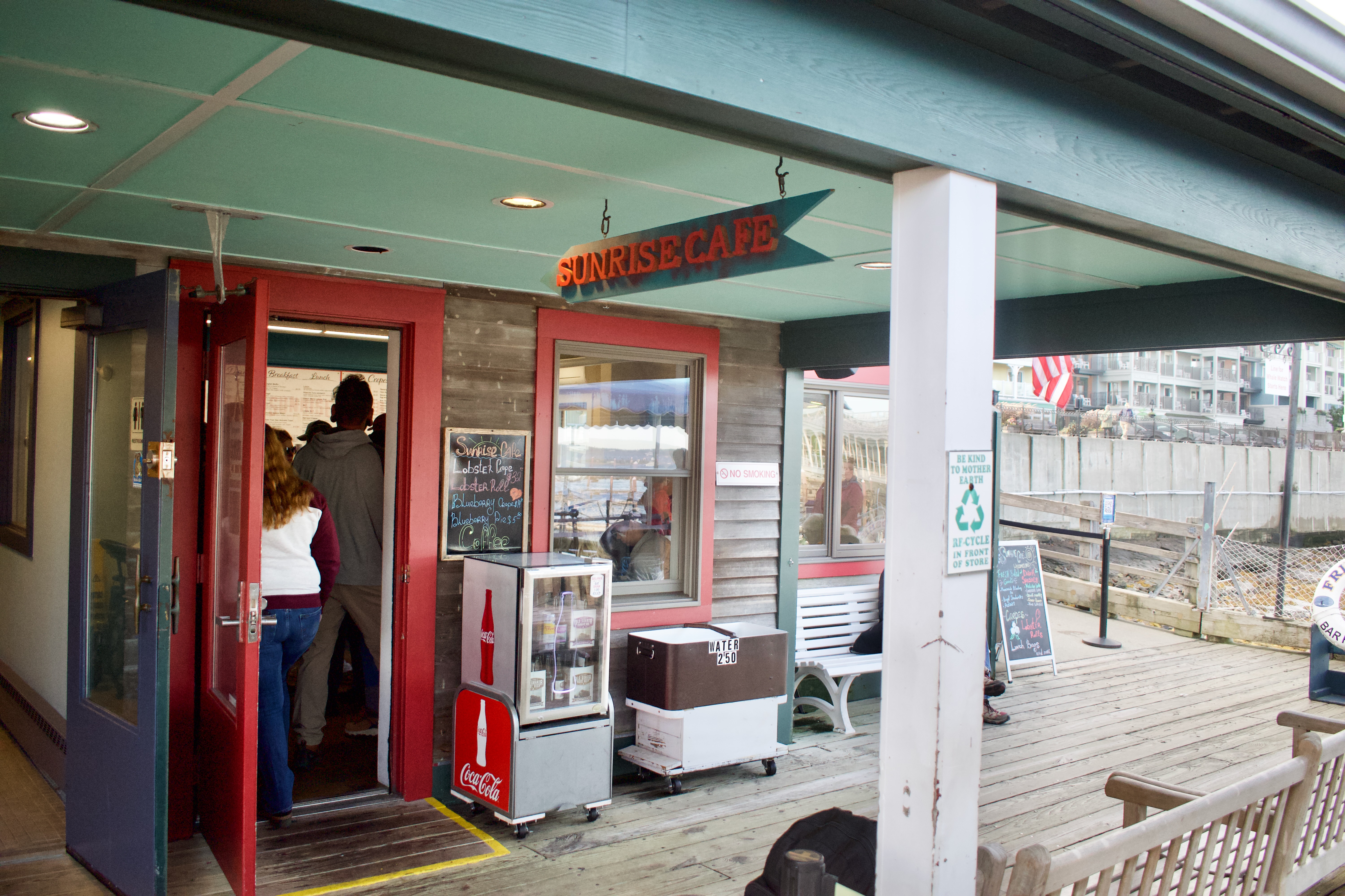 If you sign up for one of the cruises (Windjammer, Whale, Seal, Puffin, Lobster or Lighthouse), you'll board here at the dock. And you'll want to grab something to eat or drink while you wait in line. The Sunrise Cafe is right on the dock, and serves an excellent Coffee, Hot Chocolate, Cappucino, Mocha, Latte, Espresso, Frappucino or Tea (especially Blueberry Tea). There are also various muffins, rolls, bagels,, breakfast sandwiches and pastries. They can serve you lunches of lobster rolls, tuna and turkey avocado sandwiches, blueberry pie, BLTs, crepes and bagels. Since the boats don't have snack bars, you can take these lunches with you on your cruise. Their Smoked Salmon Bagel and Blueberry Cheesecake are outstanding. Everything is made right in front of you and sourced locally. |
