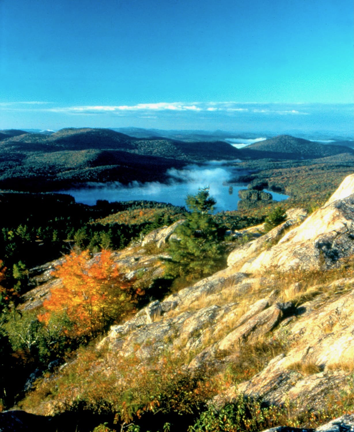 The Siamese Ponds Trail begins at the Eleventh Mountain Trailhead on Route 8 just south of Bakers Mills. You begin by cresting a ridge, then dropping down to the East Branch Sacandaga River. You'll follow this 3.4 miles to Siamese Brook, then follow the brook 2.3 miles to the Siamese Ponds, one seen in the photo at right. You can basecamp along these lakes, then bushwack to Horseshoe Mountain, Long Pine Mountain and Hayden Mountain (none of which have trails) one per day. On the fifth day you backpack out. You could also just laze around in camp and swim and fish. In October this is a spectacular trip. In July and August it's still a great trip but without all the color. We advise against it from April - June due to mosquitoes, black flies, mud and often water on the trail. |