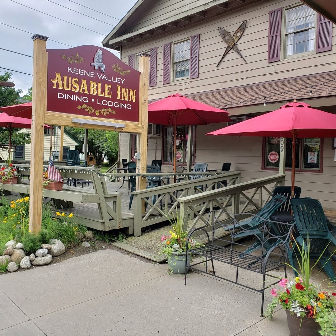 | If you've spent the day hiking the Keene Valley trails or are coming back from Lake Placid or Saranac Lake and want a halfway stop for dinner, the Ausable Inn is a strong choice. It's in the village of Keene. Their prices are very reasonable, especially considering the high quality of the food. We like being able to order Scallops or a Crab Cake as an Appetizer for only $9. There's French Onion and a Soup of the Day, but their Hungarian Mushroom Soup is one of the best Soups in the Adirondacks. Locals and frequent tourists drop by just for this one item. They offer four Salads and nine Sandwiches, of which the Thai Peanut Salad, Grilled Crab Cake Sandwich, Back Country Reuben (angus beef, swiss cheese, sauerkraut, russian dressing), Southern Pulled Pork, and Lumberjack Grilled Cheese (with thinly sliced pan seared ham) are the best. But then they offer five Burgers. The Jack Daniels Sirloin is one of the better steaks in the Adirondacks and at $18 is a steal. There are four other steaks. Their fish entrees are all good. There's Trout, Haddock, Salmon and Yellow Fin Tuna. The Wild Mushroom Ravioli is outstanding. There are three Pasta and two Chicken entrees. Both indoor and outdoor seating areas are available. This place flies under the radar. It doesn't get the attention the Lake Placid and Lake George restaurants and the well known lodges do, but it's one of the very best eateries in the entire Adirondacks. | ![]() |