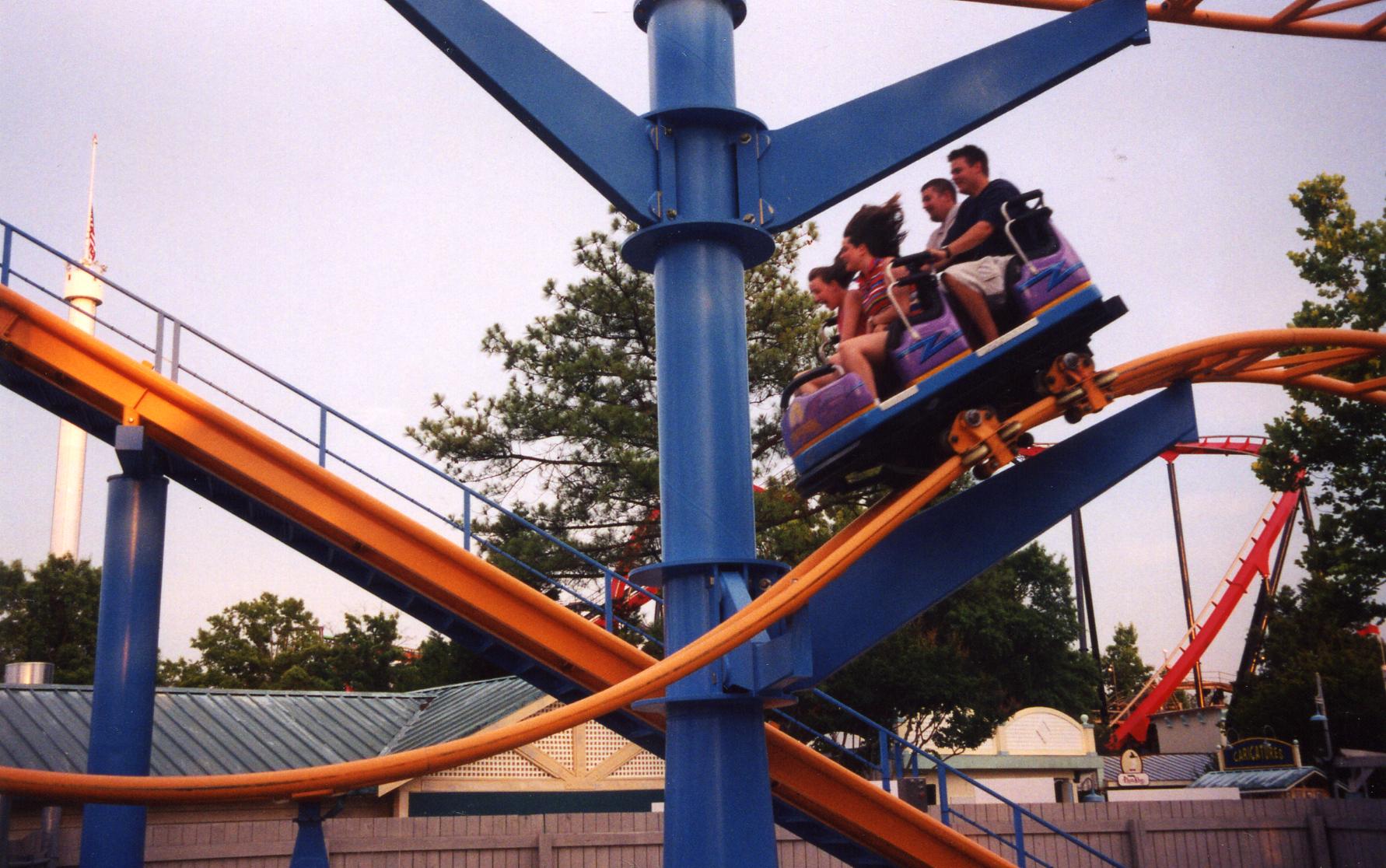 Ricochet--- Paramount’s Wild Mouse. Four person cars. Heavy trims and harsh bottoming out on steep dips. The dip coming down from the station roof is especially jolting. Indiana Beach and Idlewild have set the bar so high on this type of ride it’s hard for these Ricochets to compete, but it’s still fun. |
