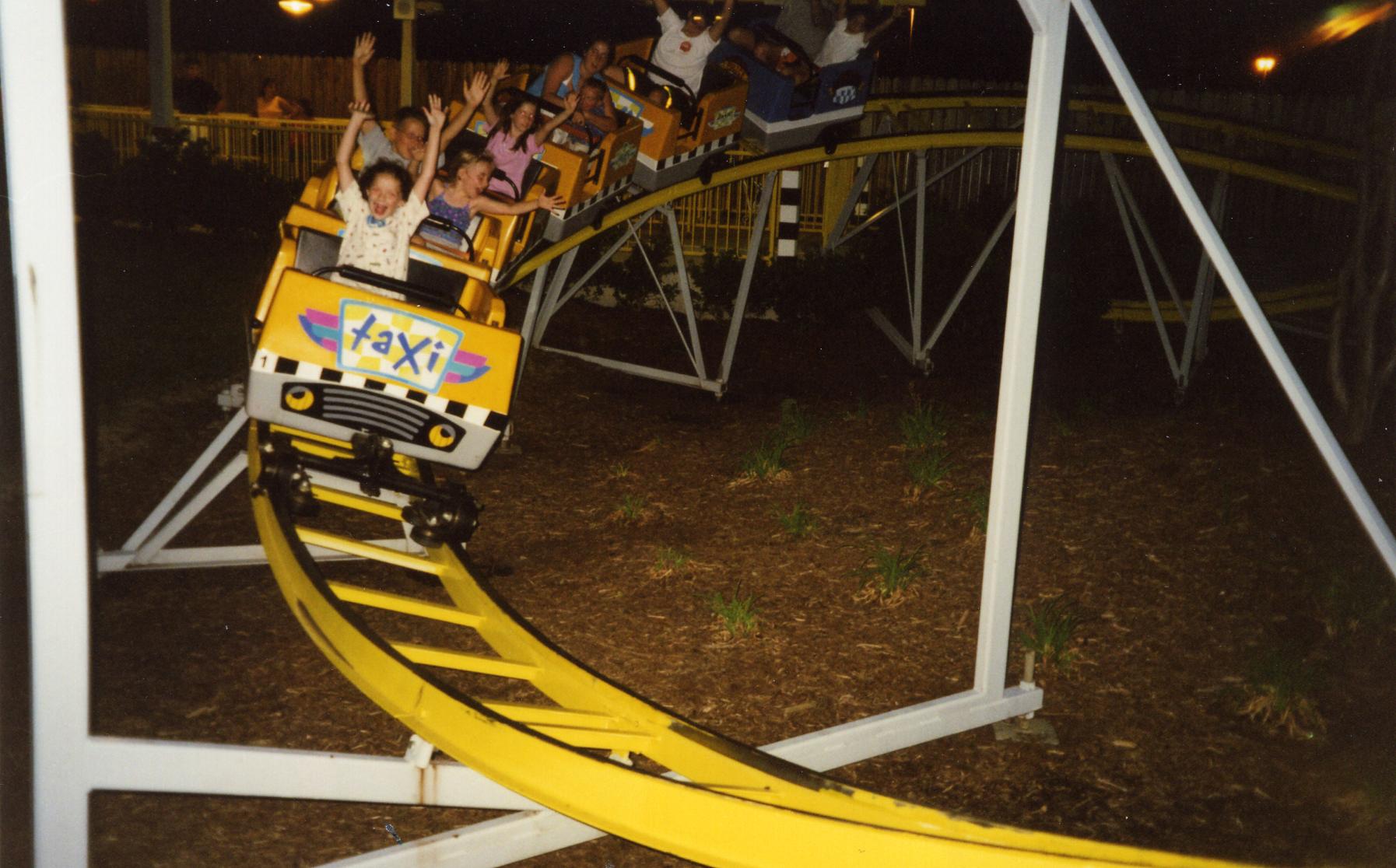 Taxi Jam --- Standard kiddie coaster. We’ve never been big fans of this type of ride because we think it jerks little kids around too much. However, while the Taxi Jam at PKI, Lil Phantom at KW and Junior Gemini at CP are squeezed into small spaces, necessitating tught turns and sudden drops, this one at least has a lot of room to roam. This allows broad sweeping curves and deeper drops with more gradual peaks and valleys, easing our concerns. It also provides a longer ride. This Taxi Jam is therefore more like CP's Woodstock Express or Camden Park's Little Dipper.