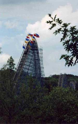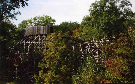 | Raven. This is the coaster that put Holiday World on the national radar. Ranked Coaster of the Year the season it debuted, it is a terrain coaster of sorts, racing down through the woods, out over the lake, and back up the hill to the station. Not an especially long ride, it masterfully blends a dozen century old tricks, the most common of which is reversing the banking at key points so riders cannot maintain their same lean or bracing.. It offers frequent pops of airtime immediately followed by quick, steep drops. The tunnel at the bottom of the first drop flavors the early part of the ride. There had been a trackage flaw right there, creating a jarring rough spot that slowed the climb up the second hill. Work in the 2005 offseason retracked that valley and smoothed out the flaw, so the trains crest the second hill at higher speed. According to the radar gun, it adds about 5 mph to the cresting rate, but whatever it is, the added air is noticeable. This is a great woodie, still in the top 10, and alone worth the trip to Indiana. It's getting a little rougher as it ages, but not enough to matter. | ![]() |