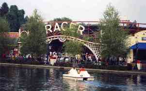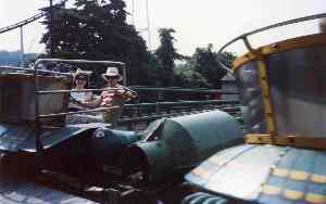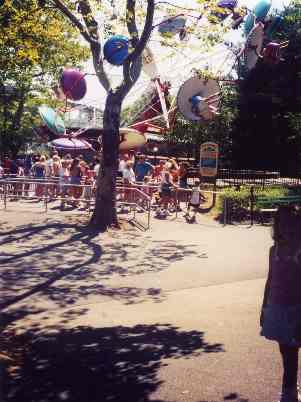 | Peddleboats. Kennywood filled in half the lake a while back, so this is not the great ride it used to be. You can't peddle under the bridges and past the Park Terrace anymore. But you can still peddle by the Jackrabbit, Racer, Shooting Gallery, Log Flume, Aero360, Carousel and Paratrooper, while looking up at the Skycoaster. After you've braved several intense rides in a row, this is a good way to relax, sit back, and catch your breath. Since you're pedalling your boat like a bicycle, these boats use no gasoline or oil, and there's no pollution. The water is clear and clean except for soft drink cups careless patrons toss in, and there's a guy continually picking those out. | ![]() |