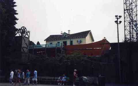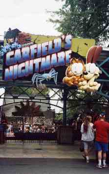 Old Mill. Rethemed in 2004 as Garfield’s Nightmare. A boat ride through the dark with scenes. You wear three D glasses so painted backdrops appear to have depth. Nostalgia deteriorating into senility. Like your beloved grandmother with Alzheimer’s, KW keeps this ride around for what it represents, but it is more tacky than charming. Needs another retheming. Surely they can keep a 1900 feel with 21st century technology. True, the history of the ride demands one turn every time you enter the park. Over a hundred years old, the same ride in the same building using the same boats on the same course on the same piece of land. A sample of what people were riding back in 1900 and, amazingly, there is always a line to ride it now. However, most KW patrons preferred the Old Mill facade to Garfield theming. This ride cries out for a deal with Disney, allowing Kennywood to theme it based on the full length animated feature The Old Mill. The storm in the Maelstrom ride in Disney World shows how effective the storm in the film could be if programmed here. The boats carried beautiful dual dragon mastheads for 100 years but they were removed during the Garfield retheming. They now decorate the Pagoda over by the Park Terrace Restaurant. This is an interesting ride from an engineering perspective. As your boat enters the building, you are pulled up an incline by a bumpy conveyor belt. From that point on, the water channel moves steadily downhill until it flushes you out the other end at the unloading dock. To test the ride, every Spring before the park opens for the season, before the water is pumped into the channel, the engineer releases a bowling ball at the peak of the incline and starts his stopwatch. He walks around to the unloading dock and waits. The bowling ball usually rolls back to him exactly 6:00 later. Halfway through this ride the boats used to emerge into the daylight