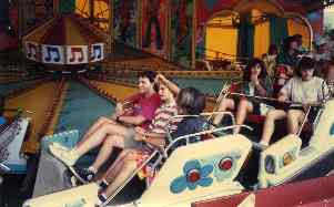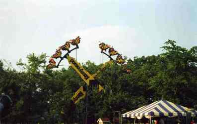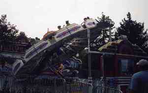 Musik Express. # 1. Shown at left. Another high speed tilted circle ride, this one to loud music. Also smooth, comfortable, well maintained and a long ride. Several other parks have models of this same ride, but Kennywood maintenance wins out. Those others are rough, jolting, with hard plastic instead of upholstered seats, they show faded paint and rust or corrosion, and their ride cycles are shorter. Many also have scratchy music speakers, which rather destroys the effect. This is one of the greatest date rides ever invented, since the rider sitting to the inside inevitably ends up in the lap of the rider on the outside, and the ride seems to go on and on.