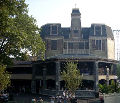 | Ghostwood Manor is the big ride for 2008 and Kennywood's latest entry in the dark ride genre it has always done so well with. This is a brilliant addition. You are called into a hallway by the long dead owner, who signs you up to help him rid his home of ghosts accumulated over two centuries. You ride a car through the mansion aiming at various targets. It sounds like a routine interpretation of the Scooby Doo Haunted Mansion interactive ride. But this takes that basic idea to a much higher level, beginning with high tech cars that do not run on tracks but instead on magnetic tape embedded in the floor. Each "room" in the mansion is a work of art, with long dead characters climbing out from behind boxes, sitting up from easy chairs or desks in the corners. Most riders we know go through a second time so they can skip the target practice and just admire the craftsmanship. This raises the ante and will probably force Kennywood to upgrade Noah's Ark and The Old Mill (Garfield's Nightmare). | ![]() |