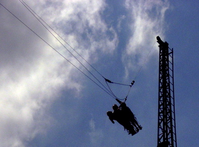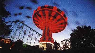 Paratrooper. #1 tied with Indiana Beach. 10 metal umbrellas with a bench seat dangling below it. These seats are more comfortable. The structure is in better shape. It runs smoother. Kennywood runs it fast, which gives you that stomach flutter on the upswing. A long ride. Your feet are brushing the treetops on every cycle. This is a 1958 ride that always attracts long lines in the 21st Century. While riding it you feel stable at all times but from the ground you're amazed to see how people's feet are above their heads and their bodies are almost inverted. The specs claim the rim only climbs to a 45 degree angle but from the ground (see photo at left) it sure seems steeper than that. Kids can ride this with parents but sit them next to you and have them keep both hands on the cross bar. This ride is a classic example of how 1950s technology using simple physical principles like centrifugal force could create great thrill rides. There are only 12 of these left in operation, and this is one of the two best. |