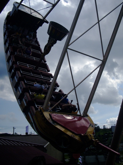 | Pirate Ship. # 1. This is one of those simple classics which when watched from a distance does not seem impressive but when ridden delivers a powerful punch. The ride takes several swings to reach its full range and at the end slows down gradually, but during the middle of the ride, when the ship swings from one extreme to the other, it produces some surprising Gs. If you sit in the middle, within a row or two of the main mast, it is a little gentler, but sitting at the front or back of the ship guarantees you'll be scrambling to stay in your seat at each apex. The airtime at those apices is similar to a roller coaster or the Kangaroo. This version has been at KW in its present location for 37 years, but it feels brand new. The finish is well maintained, the swings are smooth and the peaks are high. There's none of that grinding or rubbing that slow the ships at other parks and keep them lower at each end of the swings. It's interesting to see the rides all around the Pirate Ship come and go while it remains, consistently drawing lines. Kennywood gives you a longer ride than its rival parks. | ![]() |