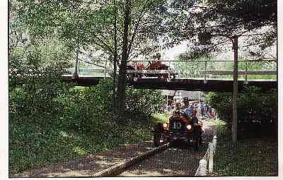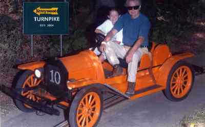 | Turnpike. # 1. Dollywood is better themed and Busch Gardens has a neat course wandering down through the forested hillside, but Kennywood has the best cars and scenery and the longest ride. Most others roam in a large circle but by crossing over itself twice KW squeezes more distance and a longer time into a smaller space. Great landscaping and impressive CoGo gas station add flavor. The original 1960 cars were gasoline powered by Briggs & Stratton lawnmower engines, but in 1996 Kennywood replaced them with these electric motors. Parents have to squeeze a little to fit but kids fit fine and parents can let their legs dangle out onto the running boards, as seen above left. The hidden stars of this ride are the landscapers, who work four hours a day before the park opens to keep the dense bush and flower cover looking great, in order to conceal the congested layout and create the appearance of much larger territory. | ![]() |