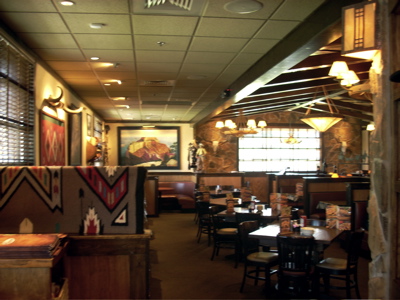 | Longhorn Steak House (interior shown top right) is a very good steak restaurant with very reasonable prices. The four dinners they're famous for are Flo's Filet (7 oz. hand seasoned), Porterhouse (22 oz. New York strip chargrilled), Outlaw Ribeye (18 oz. hand rubbed and grilled over an open flame), and The Big Sky Bleu (9 oz. topped with melted bleu cheese, then served atop a bed of red wine glazed portabello mushrooms). If none of these appeal to you, there are 10 others. The best of the appetizers are the Shrimp - Lobster Chowder and Texas Onion (large onion petals lightly battered, fried and served with a dipping sauce). There are four salads, ribs, salmon, shrimp, lobster, and Honey Mustard Chicken. Desserts include Key Lime Pie and Fried Cheesecake. Bring your camera; the Longhorn is right below the 12 chimneys, a dramatic sight. | ![]() |