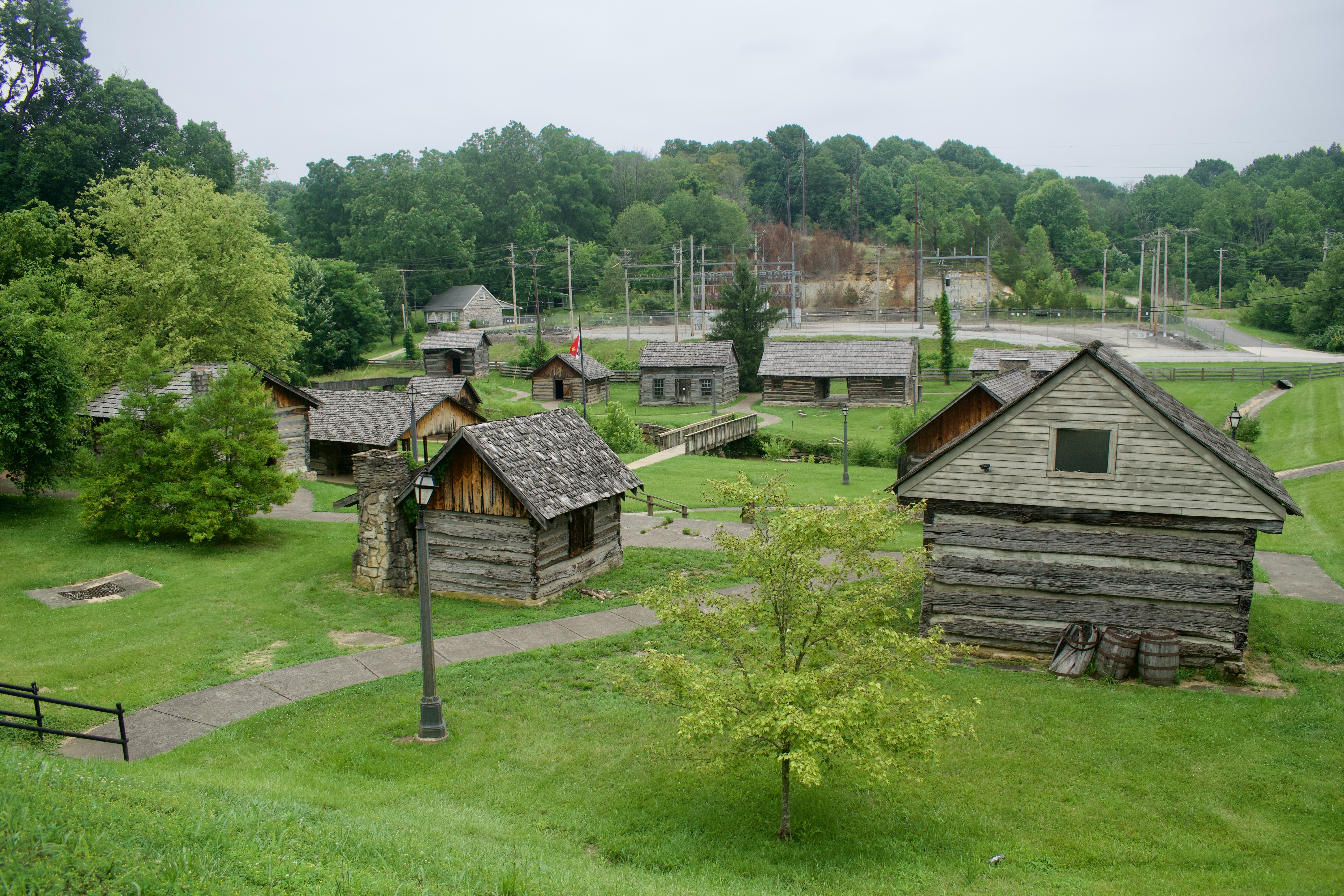 Old Bardstown Village is a collection of important log cabins rescued from various places in Nelson County, dismantled, brought here and reassembled. Included are a doctor's office, blacksmith's shop, school, church, store, bar, and several family homes. The contracter laid a foundation under each cabin, calked between the logs and built new roofs, so the cabins are sturdy and well protected from the weather. You can go inside many and look inside the rest. They're not a reconstruction of a real village but a simulation of what a typical village would have looked like. This would be an ideal site for costumed reenactors to perform tasks of that time period and answer visitors' questions, but right now the money for that is not available. Out of sight to the left is an old mill with a classic sluice and wheel, but it needs work to reactivate. Fittingly, Town Creek runs through the collection. Town Creek was the site of the original Bardstown settlement. | ![]() |