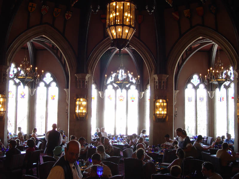 The most spectacular restaurant in the Magic Kingdom is Cinderella's Royal Table on the main floor of The Castle. The designers haven't missed a trick : high peaked arches, leaded glass windows, medieval flags, coats of arms, suits of armor, elaborate light fixtures, and, of course, Cinderella coming around to pose for pictures. If you have girls in the family -- ages five through 18 -- you must eat here. The big problem is reservations. You have to make them months before you arrive at peak seasons. During other times you have to make them in the same phone call as you reserve your lodging and park tickets. This is also the priciest of the Magic Kingdom restaurants, but you're paying for a lot more than the food. However, while the food is not five star quality, it's good. Cinderella's Table serves three meals a day. The classic breakfast includes juice, milk, eggs, bacon, french toast, yogurt, and your choice of pastry, with tea or coffee available for adults. There's a bit of theatrics to begin lunch, in which Cinderella summons her staff and orders a special appetizer for everyone. Then the big lunch time hit is braised ribs, but you can get chicken, mac & cheese or other entrees. The sherbert is great for dessert, or you can request chocolate mousse. Dinner features chicken, beef or a vegetarian pot pie. Ths kids can order pizza or chicken strips. Window seats here are especially spectacular. |