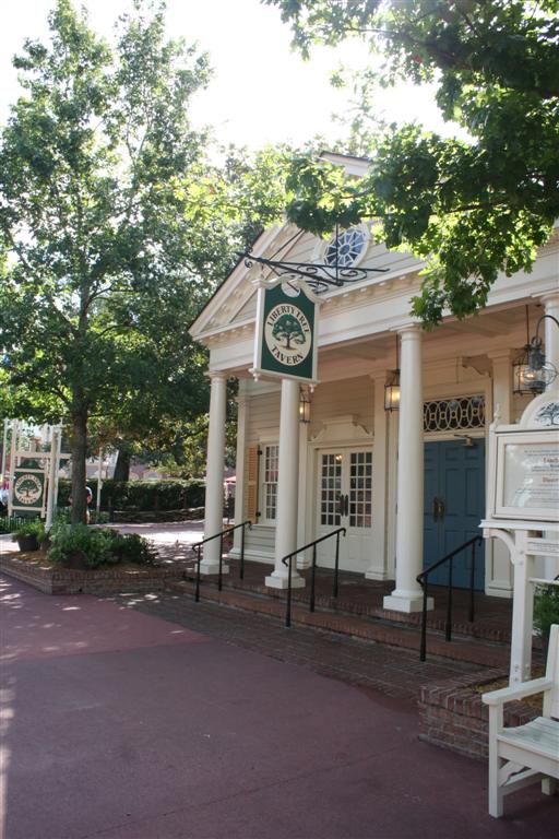 Facing the river in Liberty Square, the Colonial Boston section of the park, Liberty Tree Tavern is the best sit down lunch stop in the Magic Kingdom. The Liberty Tree was the beloved tree the Sons of Liberty met under, hung lanterns from and used as their symbol. The original tree still stands, and a cutting from it is now 40 years old and spreads its branches just outside this tavern. Inside, the architecture and decor are modelled after The Green Dragon, the restaurant Paul Revere, John and Sam Adams, Johnny Tremain and John Hancock ate at regularly. The lunch menu features items they might have eaten, although sadly it omits Donkers, the famous colonial dumplings, and their famous Ales. However, they serve a fine New England Clam Chowder, and Today's Kettle (soup of the day) is always good. They list their Colony Salad among the entrees, but it's a fine salad : apples, pecans, cheddar, cranberries, grilled chicken and greens. There's a Pasta with chicken, tomatoes, mushrooms, shrimp and basil. And there's a Vegetarian Burger, with one of the better potato quinoa vegan patties you've tasted coated with tzatziki sauce. However, we recommend the Pilgrim Feast (herb bread stuffing, roast turkey, mashed potatoes, gravy and fresh vegetable), New England Pot Roast (braised beef in cabernet wine and mushroom sauce, mashed potatoes and vegetables), or Lamb Stew. If none of these appeal to you, their Fish of the Day is always outstanding, or there are several sandwiches. Desserts include Toffee Cake, Chocolate Cake, Fruit Crisp, Johnny Appleseed (white cake filled with apples and cranberries and topped with ice cream), and Sherbert With Berries. The Coffee and Freshly Brewed Iced Tea are outstanding, as are their Cappucino and Hot Cocoa. They also serve Chocolate Milk, Lemonade and soft drinks. Dinner is a different story. It's a preset all you can eat menu with fewer choices than lunch. Everyone is served a large salad and the Patriot's Platter (roast turkey, carved beef, sliced pork, mashed potatoes, vegetables, herb bread stuffing, and macaroni and cheese). Dessert is the Johnny Appleseed (white cake filled with apples and cranberries, topped with ice cream). Beverages are unlimited refills. Given the greater choices, we think Lunch is the better deal, but if you're starving after a long day in the park, Dinner is guaranteed to fill you up. |