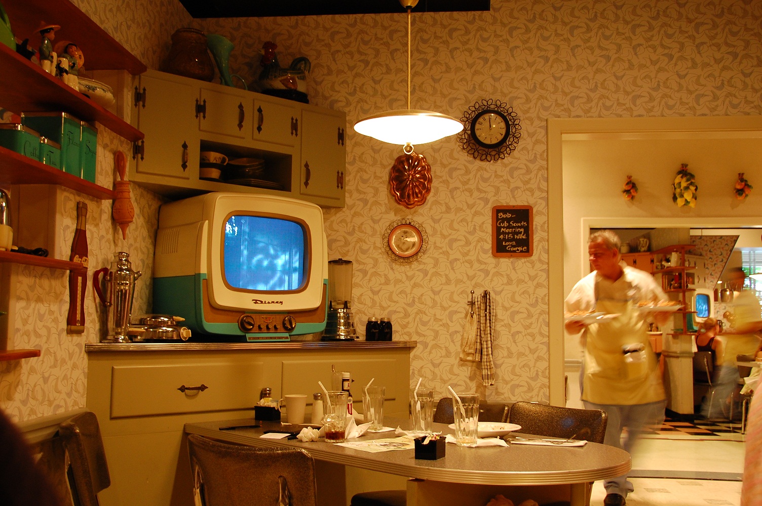 Over in Hollywood Studios, 1950s Prime Time is guaranteed to be the funniest restaurant you've ever visited. Decorated like a 1950s kitchen, it's complete with black and white TVs playing old sitcoms and advertisements. It really is like your grandmother's or maiden aunt's house on Sundays, with lava lamps, formica tops, and cat clocks with the eyes and tails rolling back and forth. This is more like a museum. It's the only restaurant where you get fussed on. Continually. Your server plays the role of Aunt Nelda or Cousin Francis. She'll will leave your plates, utensils and napkins stacked and tell you to set your own table, because "your mother doesn't work here." You're reminded to go wash up before dinner, sit up straight, keep your elbows off the table, and not talk with food in your mouth. You can't order dessert until you clean your plate. They give everyone napkins and crayons while your food's prepared and hang the best artwork on the refrigerator door. The food here is only average but you're paying for the decor and the abusive waitresses. But the Fried Chicken, Pot Roast, Chicken Pot Pie, Hot Roast Beef Sandwich and real milk and ice cream Milkshakes are outstanding. Assuming you eat all your veggies, the best dessert is the S'mores. |