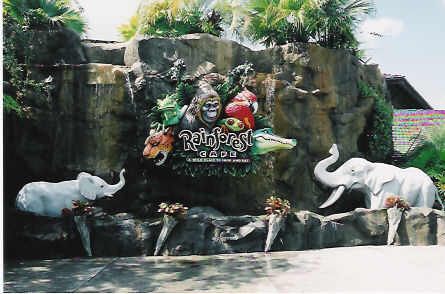 The Rainforest Cafe is one of the zanier places to eat at Disney World. This one is located just at the entrance to the Animal Kingdom, so you could eat there without actually having a ticket to enter the park itself, or you could eat dinner there after the early closing of the park. Inside you'll have tropical birds, huge fishtanks, thunderstorm every 30 minutes, and large animatronic jungle animals peering at you through the lush vegetation. The menu is spotty; some items are very good, others only average. Among the appetizers, we like the Chili (melted cheese, tomatoes, onions, green chilis) and Chimi Cha Cha (wonton stuffed with chicken, corn, onions, beans, lime, roast red peppers, cheese). Their Tomato Basil Soup and Clam Chowders are very good. There are six pretty good salads, of which the best two are the Calypso (lettuce, baby greens, goat cheese, cranberries, strawberries, red onions, pecans) and Volcanic (grilled chicken, lettuce, bleu cheese, olives, tomatos, chopped egg, carrots and bacon). They offer eleven burgers and sandwiches. The best entrees may be the Paradise Pot Roast, Amazon Feast (rotisserie chicken and slow roasted ribs) Tilapia Salmon, and the New York Strip Steak (huge; two normal eaters could share one). Better than the one in Downtown Disney but Does Not Accept Disney Meal Plan. |