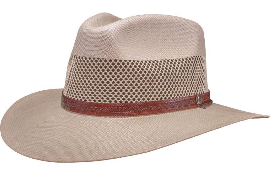 The hats are hand cut, hand stitched, hand formed, and hand trimmed for a meticulous finish. They're not cheap (the Florence reviewed here costs $57), but such a hat is an investment. It will last a lifetime, and to make sure it does it carries an unconditional lifetime guarantee. American's latest Freedom model, the Florence, is a classic. It features a 3.5" inch brim, wide enough to shield the eyes, face, ears and neck but not so wide as to become unwieldy or look extreme. It's lightweight. The 4 inch crown with a 2.5" perforated area allows air to circulate to keep the head cool. There's a strap with adjustable slider to keep the hat snug in wind. If you don't want it you can tuck it up inside the crown. This is not a cowboy hat or an Indiana Jones hat. It's a Panama style. It is not meant to be shaped into a rodeo style, or country music style. The lacquer waterproofing prevents you from bending up the sides or bending down the front and back. Steaming it fails to penetrate the lacquer. Instead, it's a classy urban style, meant to be worn on a Kentucky horse farm or a beach vacation or on your evening walk. It's the style of broad brimmed hat that was worn by ranch owners and managers, not the cowboys who drove the cattle and did the manual labor. It's also very close to the level brim worn by park rangers and forest rangers and some law enforcement officers. The brim comes precast with the front and back very slightly turned down and the sides ever so slightly turned up. If you get caught out in a sudden Summer rain, the Florence is completely waterproof. |