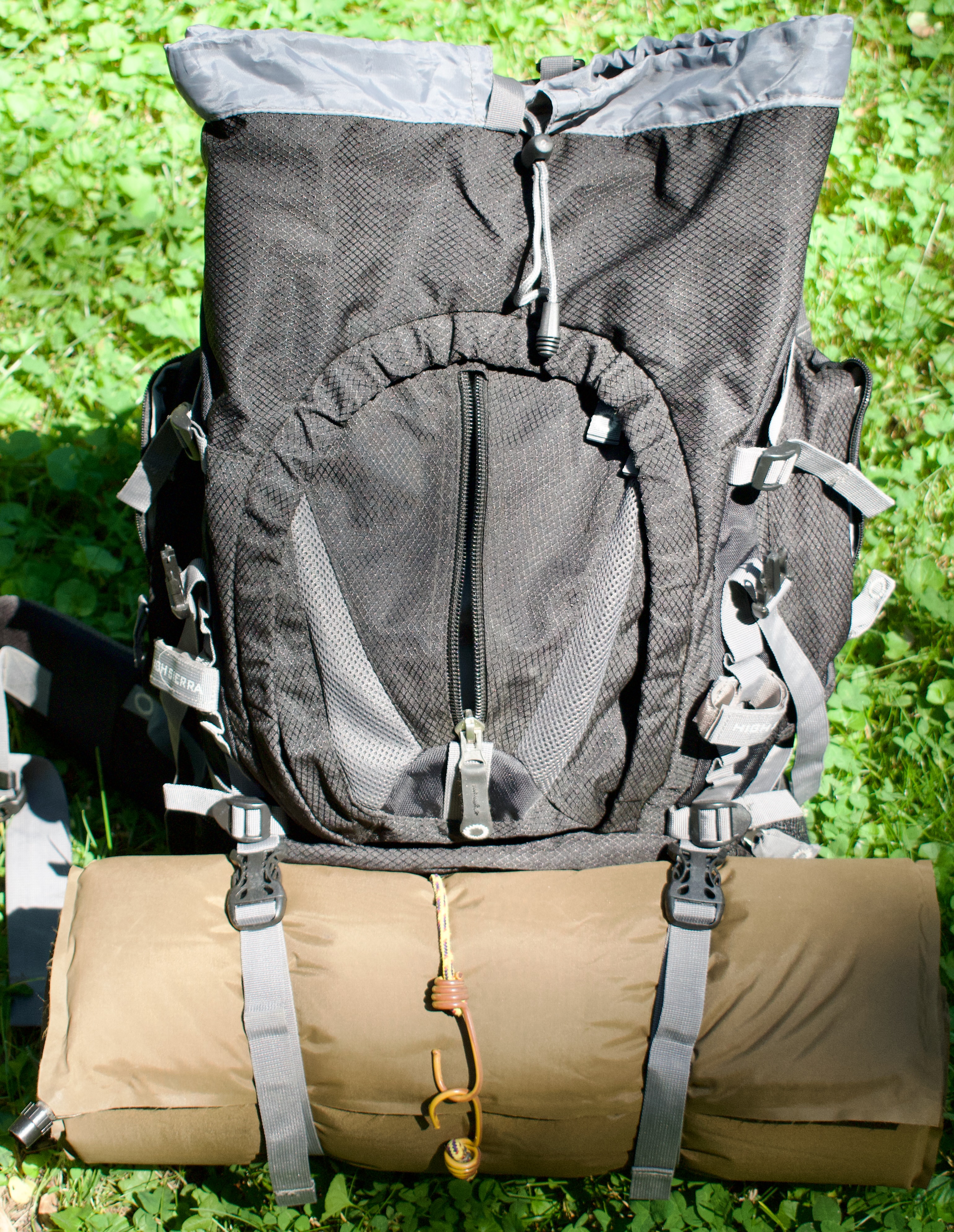 There are numerous straps, daisy chain loops and tabs for attaching any number of items to the outside of the pack. Most users attach their sleeping pads to the straps just above the sleeping bag compartment (photo, left) The pad sticks out from the main pack (see photo below) but since it weighs almost nothing it doesn't affect weight distribution. The top corners have openings for people who like to use the Camelback water bags. The hoses come out the corners and allow you to drink while hiking without taking off the pack. Inside, there's a special compartment for the Camelbak to protect your other contents in case of a leak. On the front of the pack is a large pocket (photo, left) with an outside compartment for flat items, like maps, folded rain parkas and pants and mosquito netting. The circular zipper on this large pocket (photo, left) opens into the main compartment, so you can quickly access items like a first aid kit or fleece jacket without digging down from the top. The top flap contains two roomy pockets which most backpackers will use for liner socks, hiking socks, underwear and used socks and underwear. It's that top pocket you see sticking up higher than the wearer's head in the photo below, and with the High Sierra logo on it in the top photo. However, unlike some packs, this top pocket does not detach for use as a daypack. |
