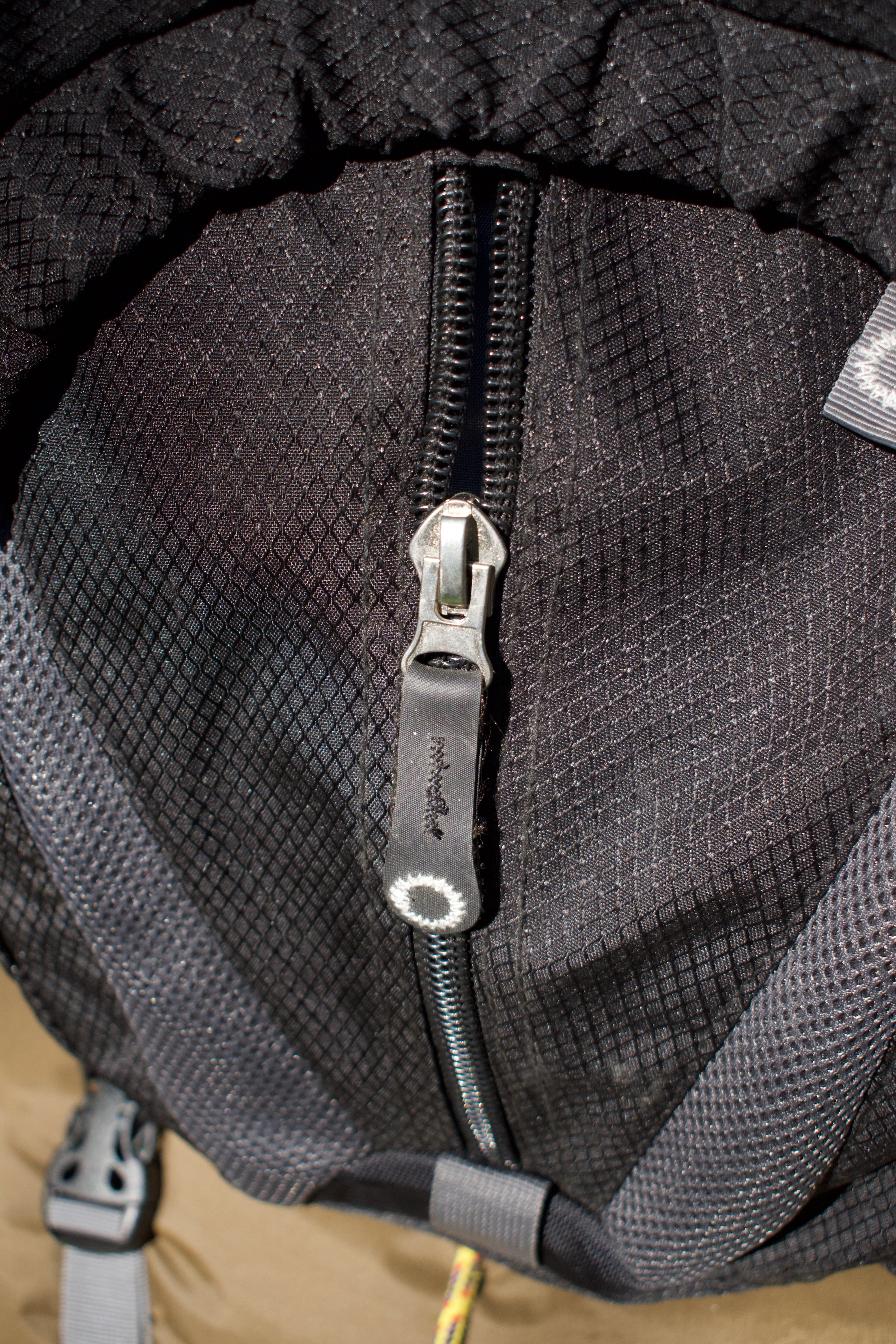 The Appalachian was well thought out and addresses all these complaints. Since the High Sierra brand does not carry the credibility of the more established companies, It's available at $100 or less. The fabric is a heavier, more abrasion proof fabric called Gridweave Duralite (photo, left). It's extremely tough. Critics say it makes the pack heavier but High Sierra is selling the pack to people who are willing to tolerate more weight to gain durability. The zippers are High Sierra's own in house versions. They're metal and heavier (also seen in photo, left). Again, they add some weight to the pack but are designed to last forever. These zippers are even heavier than the ones on the old Loadmasters. But the weight issue needs inspection. The 75 liter version weighs in at five pounds, the 90 liter version at six pounds. The famous Loadmaster weighs 6.8 pounds. A typical modern backpack weighs 4 - 4.5 pounds. So the Appalachian is from half a pound to a pound to at most a pound and a half heavier than today's packs and less than the Loadmaster. Considering its added features and durability this seems a reasonable tradeoff. The usual standard for modern backpacking is 30 pounds total carry for a five day trip (Ultralite hikers would say 20 pounds). If you have the 75 liter Appalachian, this would leave you 25 pounds for food, water, clothing and equipment. The heaviest items a backpacker carries are tent and water. A 20th Century tent weighs 3-4 pounds. The new high tech tents weigh about two pounds. Water is heavy but at most you won't be carrying more than five pounds of it. If you just carry the usual two full bottles they should weigh 2.8 pounds combined. So at most your tent and water will weigh nine pounds, leaving you 16 pounds for everything else. Most backpackers will carry a lighter tent and less water, totaling only seven pounds, leaving 18 pounds for everything else.