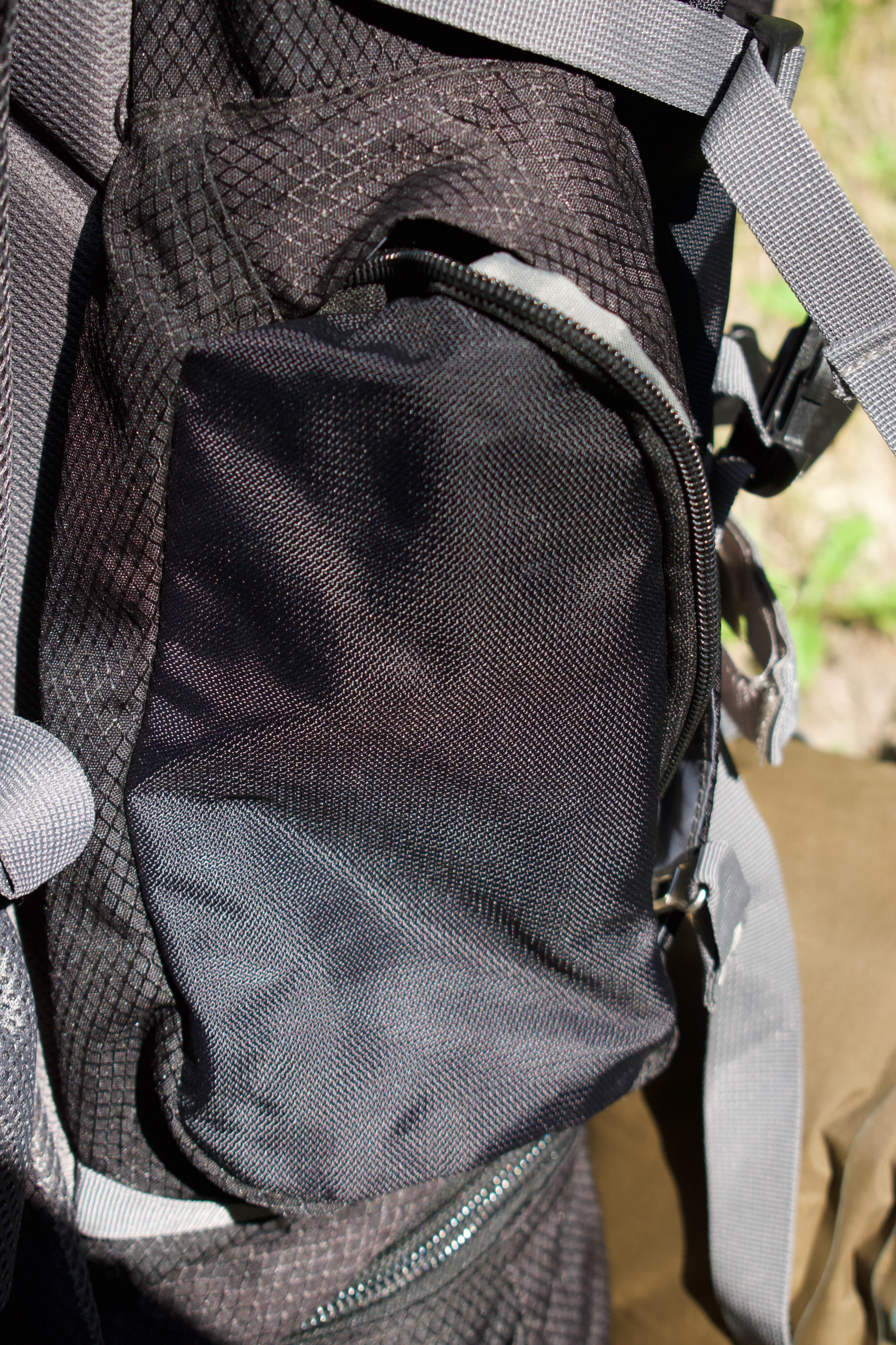 The Appalachian has pockets on both sides, on top, and on the front, allowing the old fashioned 20th Century style of organizing items in easy to reach places. The left side pocket (photo, right) can be used for bathroom items : comb, shampoo, toothbrush, toothpaste, flosser, flossing clips, razor, shaving lotion, soap, washcloth and small towel. Most hikers use the right pocket for their water purification kit. However, you could use it for a compact fishing outfit, especially if you carried a Daggerfish handlining rig or a Plussino telescoping rod or one of their imitators. Some use it for their compact camera, like the Nikon Coolpix L840. Others use the right pocket for their flashlight, mosquito netting, sunscreen, mosquito spray, or binoculars. The Appalachian includes a sleeping bag compartment large enough for a Summer polar fleece bag (which doesn't compress) or a Winter down 0 degree bag (which does). In the top photo, the sleeping bag compartment is the one wirth the "75" imprint on it. The zipper extends straight across rather than a horseshoe shape, so you have to stuff the bag in one handful at a time. But once in, the heavy duty Gridweave Duralite fabric protects it well. If you have a summerweight down bag, which compresses, you'll also have room for a pillow in the compartment. The bottom of the bag is an extra heavy duty pad so you can set it down on the ground without worry. One of the Appalachian's best features is a hidden compartment between the sleeping bag compartment and the ground pad. In that compartment is a rain cover which when fully extended covers the entire pack. It does a great job of keeping the pack dry whether you're hiking or stopped for the night. The cover is attached to the bottom of the bag so it won't get lost, although you should try to dry it out before folding it back into the hidden compartment. At the bottom corners of the pack are beverage holders (again, see top photo). Most hikers can reach back and retrieve one of the bottles while they hike.