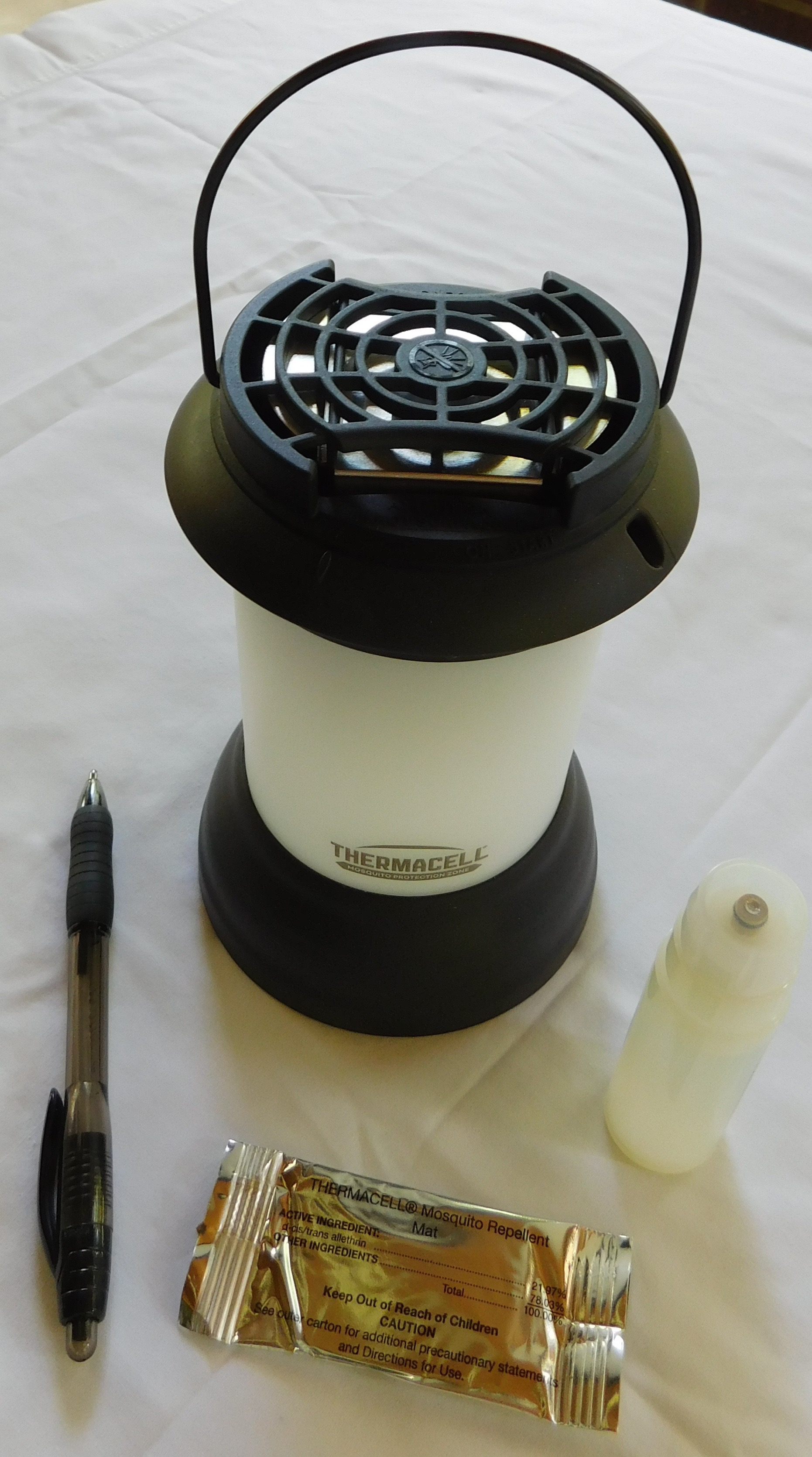 We have to be outside. We make our living there producing Outpost. Not only do we see rain more often and heavier, but because of it there is more water laying around in ponds, puddles and streams between rains. Areas that used to dry out in late Summer now stay wet until cold weather sets in. Areas in the Southwest that were rarely wet are now wet frequently. Areas in the high Rockies where water was locked in ice and snow now has meltwater accumulating in ponds, pools and runoff. The Mosquito problem is the worst we've ever seen. There are not only more of them, but they're bigger. In Wyoming, Minnesota and Maine they joke about naming the Mosquito the official state bird. So we've been testing various remedies. Against all these squadrons of Mosquitoes now arrives the Thermacell. We should state up front that this is not a commercial. Thermacell is not paying us to promote it. We set out to find a Mosquito repellant we could use ourselves and recommend to readers and this is what we found. Thermacell is basically a diffuser. The home model looks like a lantern, and if you insert three AA batteries it'll work like one, too. We've included the ball point pen in the photos to indicate size. You insert the white plastic butane cartridge into the bottom. Then you open the metallic package, remove the pheromone wafer, and slide it into the top slot. Once you turn on the lantern, the butane burns, rising through the wafer, and diffuses the antiMosquito pheromones into the surrounding air. You have to turn the lantern on, then go back inside the cabin or tent for about half an hour. After that half an hour, there will be zero Mosquitoes in an area of roughly 15 feet x 15 feet around the lantern, which is easily the size of the typical porch or campfire area. The Thermacell is not perfect. It doesn't work under all conditions. The biggest condition under which it does not work is air movement. If a breeze is moving across your camp or cabin porch, the Thermacell doesn't work. But of course, if a breeze is blowing, Mosquitoes are usually not a problem anyway. Its effectiveness is also reduced, but not eliminated, if the people within the 15 x 15 area are in constant motion. But again if you or your companions are moving around, Mosquitoes are usually not a problem anyway. The Thermacell is ideally suited for an evening when a group is setting up camp, fixing dinner, sitting around a campfire or fishing from shore. |
