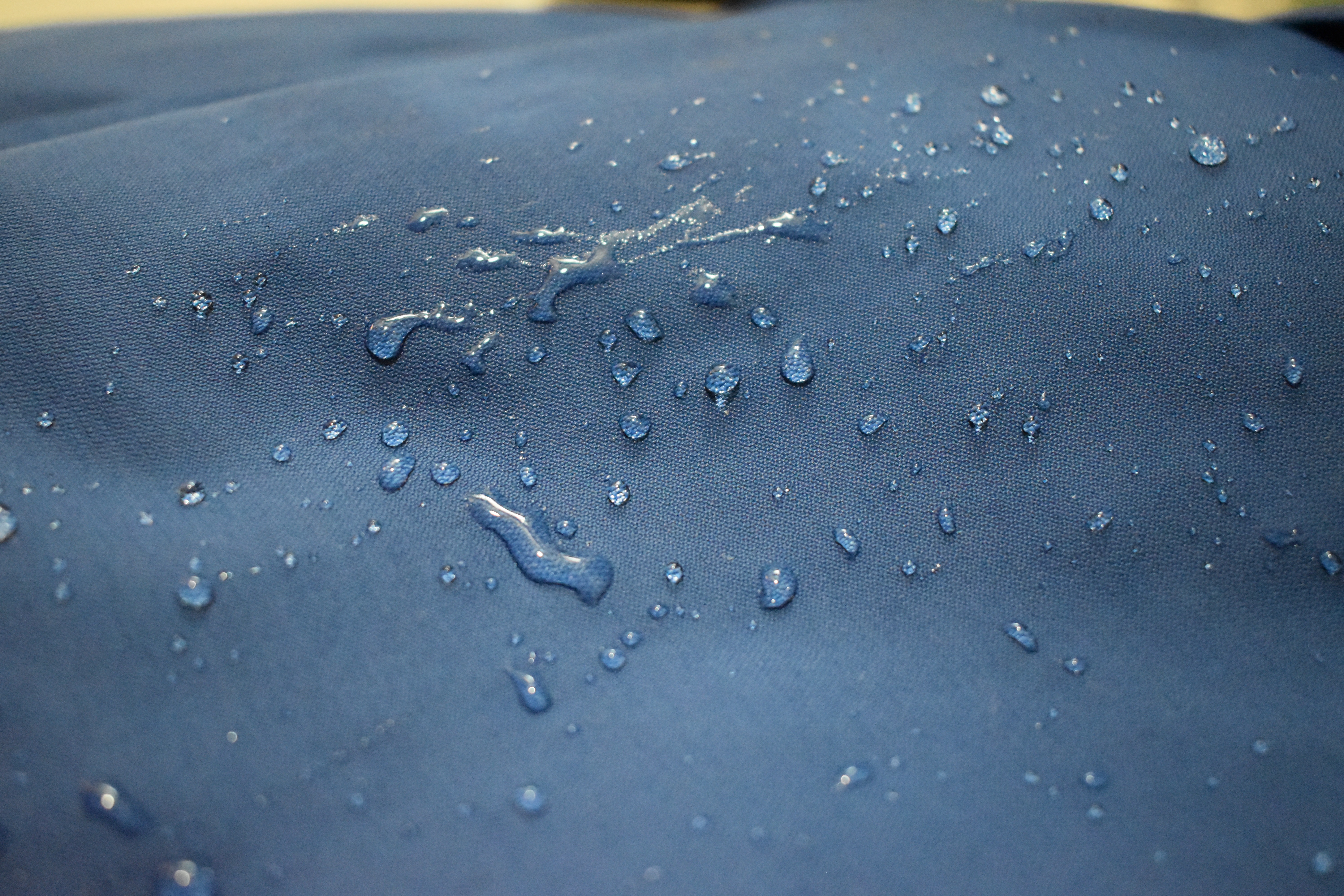 The jacket comes only in a rich blue with black shoulders. This is an expensive garment. It usually sells for at least $200, although you can find it for less at large volume outlets. Since it's not down, it's not compressible. We carry it in our packs, but it does take up space. However, it rolls up fairly compactly. The Interchange is nylon and polyester so dries quickly. It can be machine washed. It's a dressy garment. You can wear it about town without looking like you just stepped off the trail even though you may have done just that. The technology in the Interchange is well thought out. The outside surface is an impenetrable waterproof membrane (Omni-Tech, not Gore Tex) which does not allow moisture to move from outside in. In a rain, water beads up on it (photo, right). |